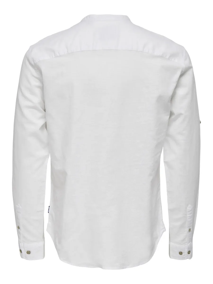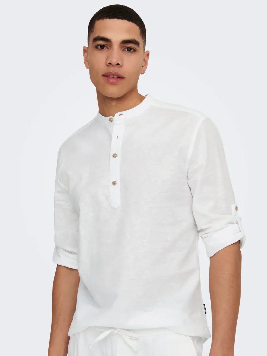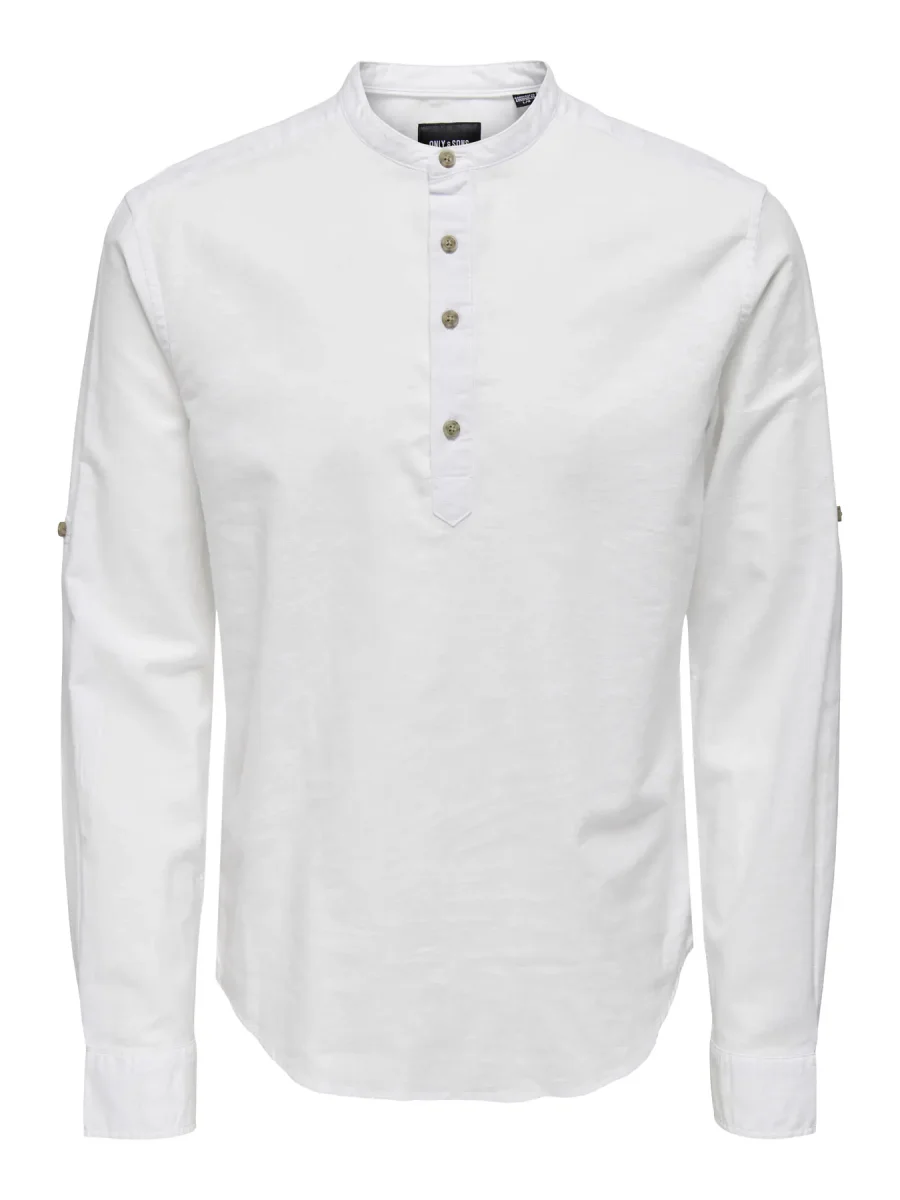 Camicia collo alla cinese, manica lunga, abbottonatura a mezzo bottone, slim fit.