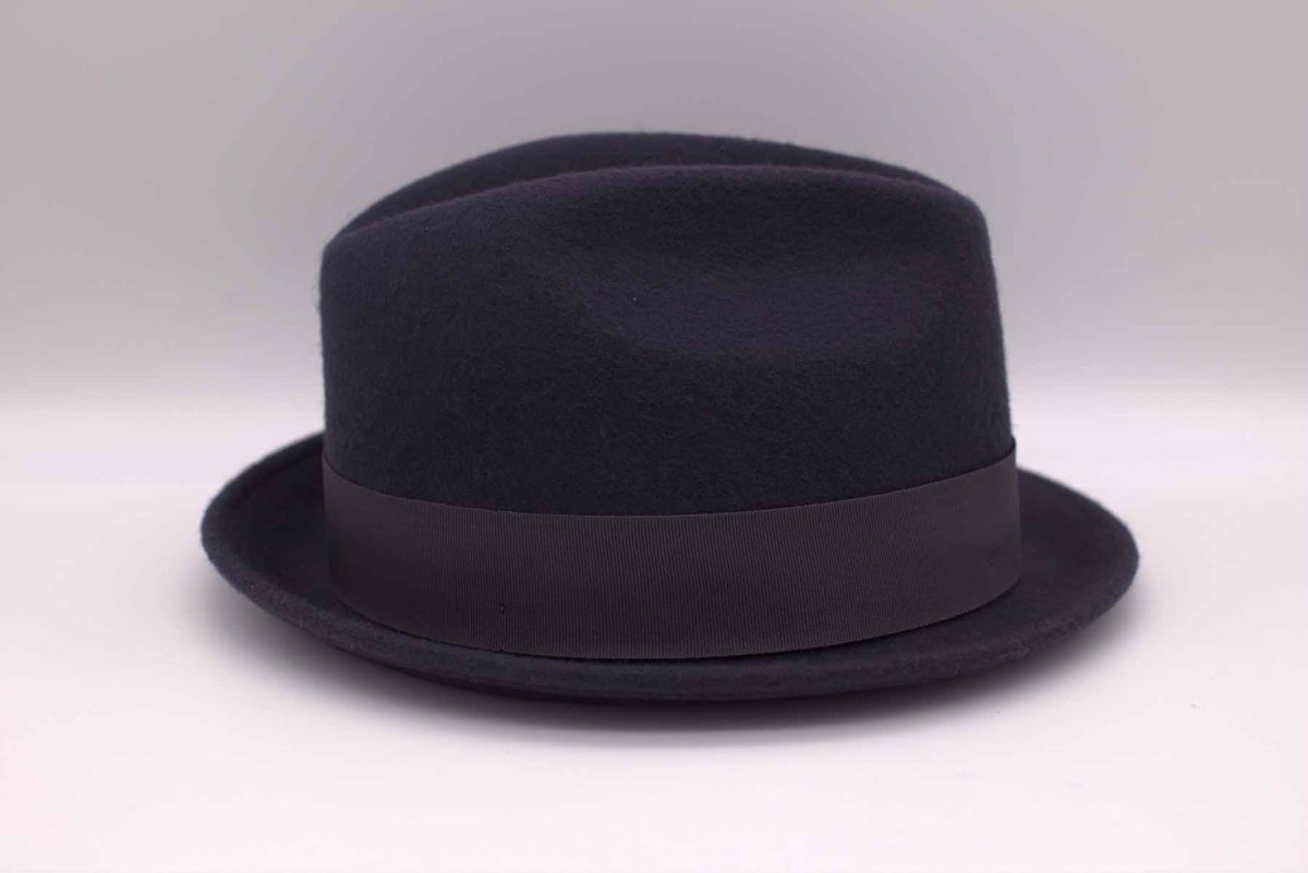 Cappello blues da uomo glamour in feltro grigio scuro, incavato nella sua lunghezza con cupola a tronco di cono e tesa larga. Impreziosito da una fascetta in grosgrain abbinata.