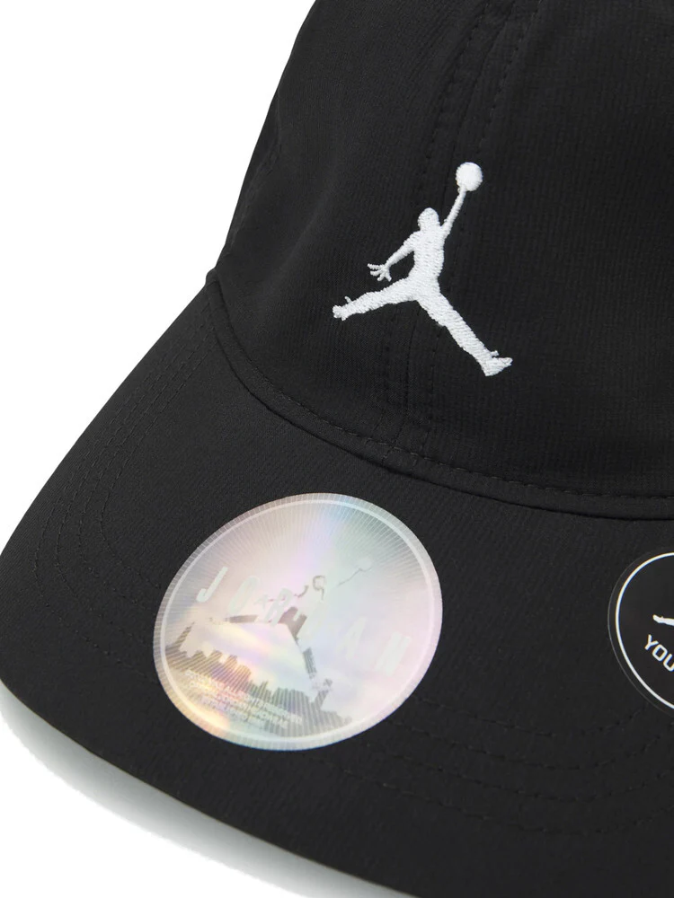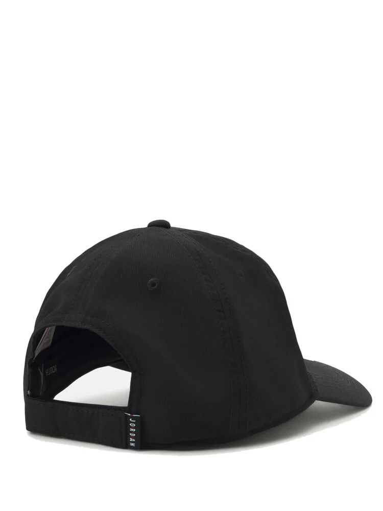 Cappello Nike Jordan nero da bambino, modello 9A0724, realizzato in tessuto a tinta unita. Questo berretto Jordan ha la visiera rigida, la chiusura posteriore regolabile con velcro e il logo del brand sul davanti a contrasto colore.