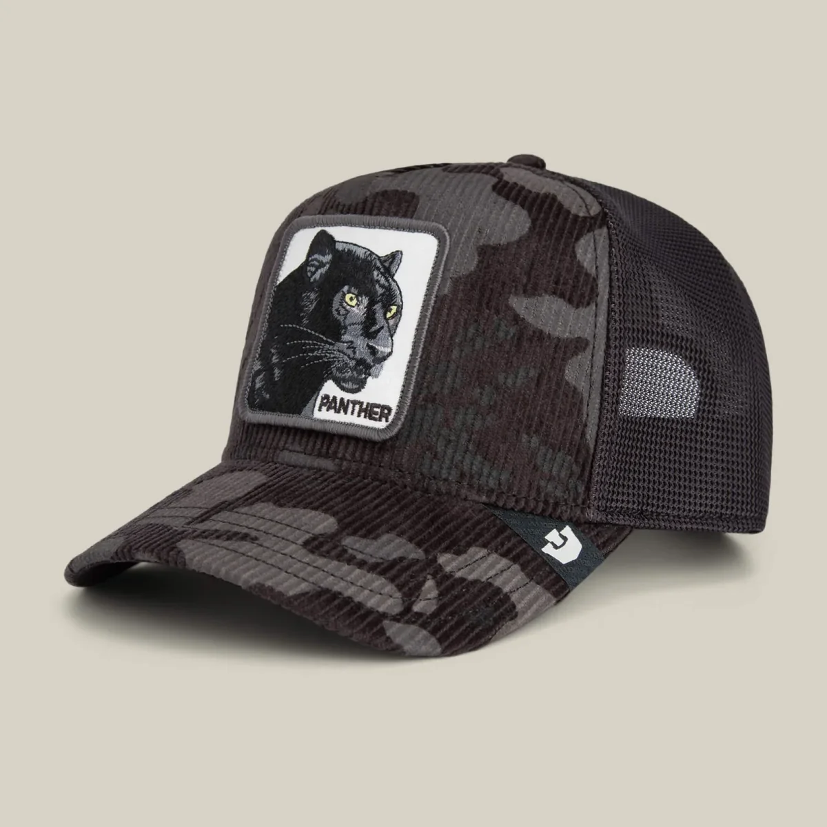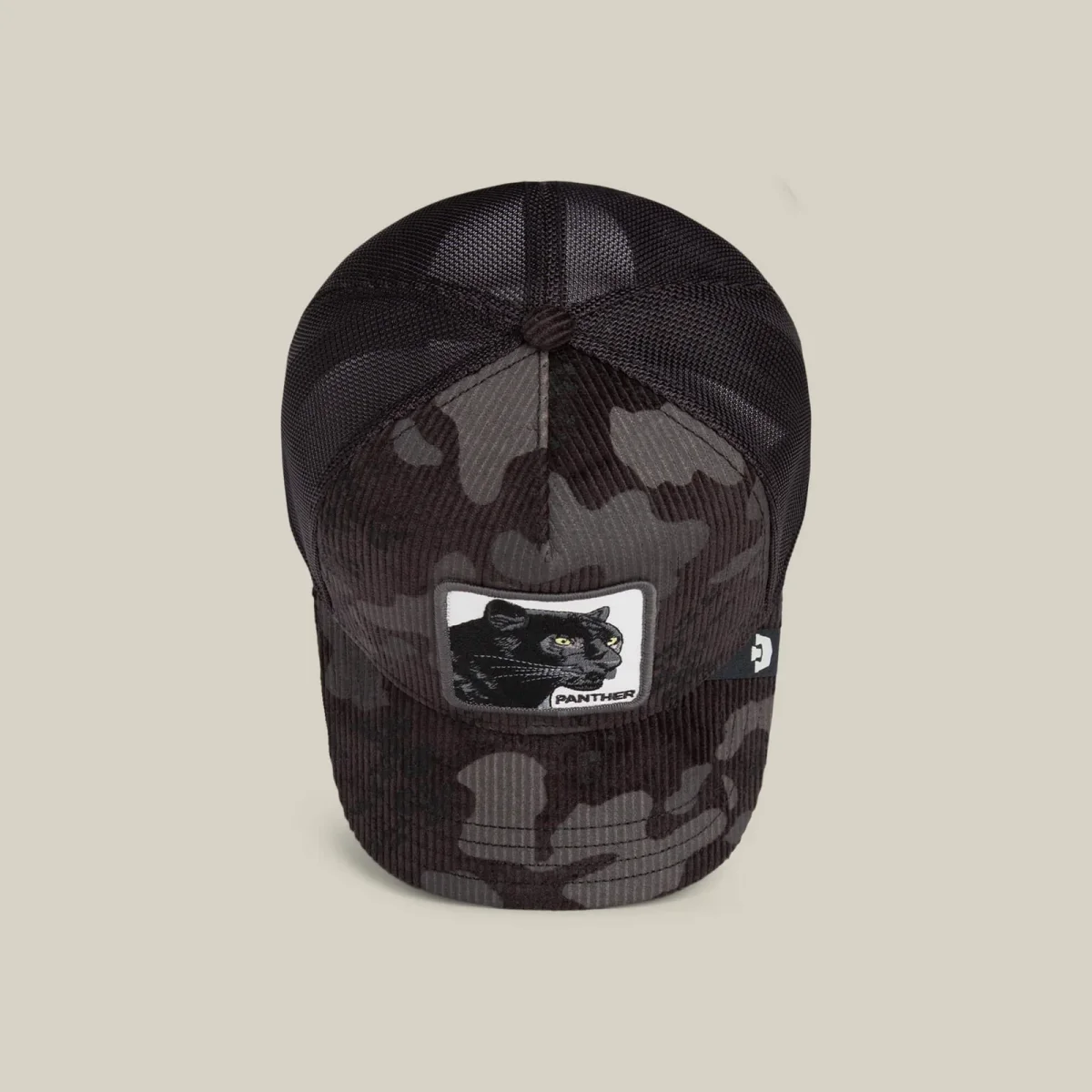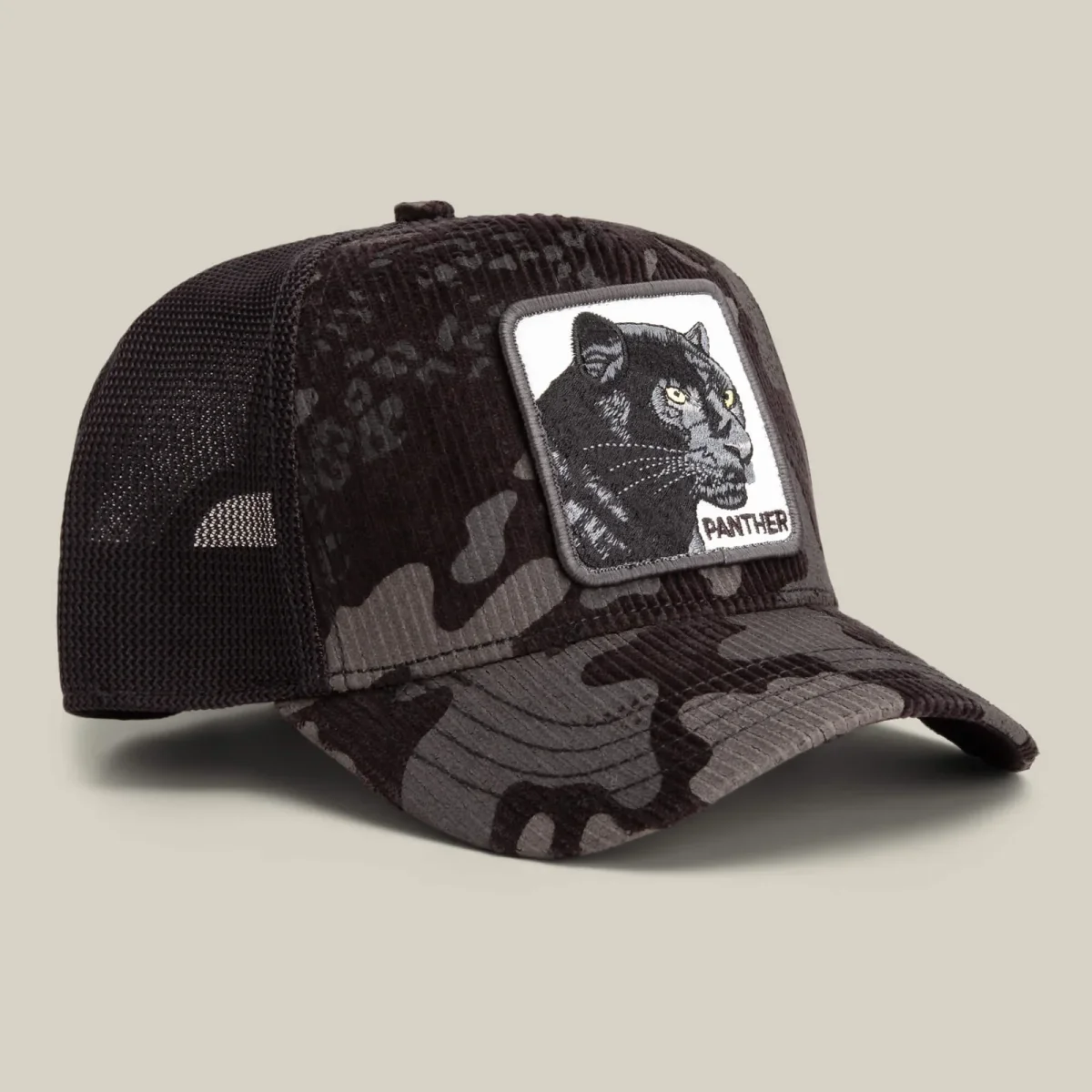 Il Panther Camo è un velluto a coste color antracite scuro con strati di camouflage stealth su tutta la superficie. La rete lo mantiene fresco, la toppa lo rende intenso. Ogni cucitura è studiata per trasmettere una sicurezza silenziosa, quella che osserva la stanza prima di entrare.