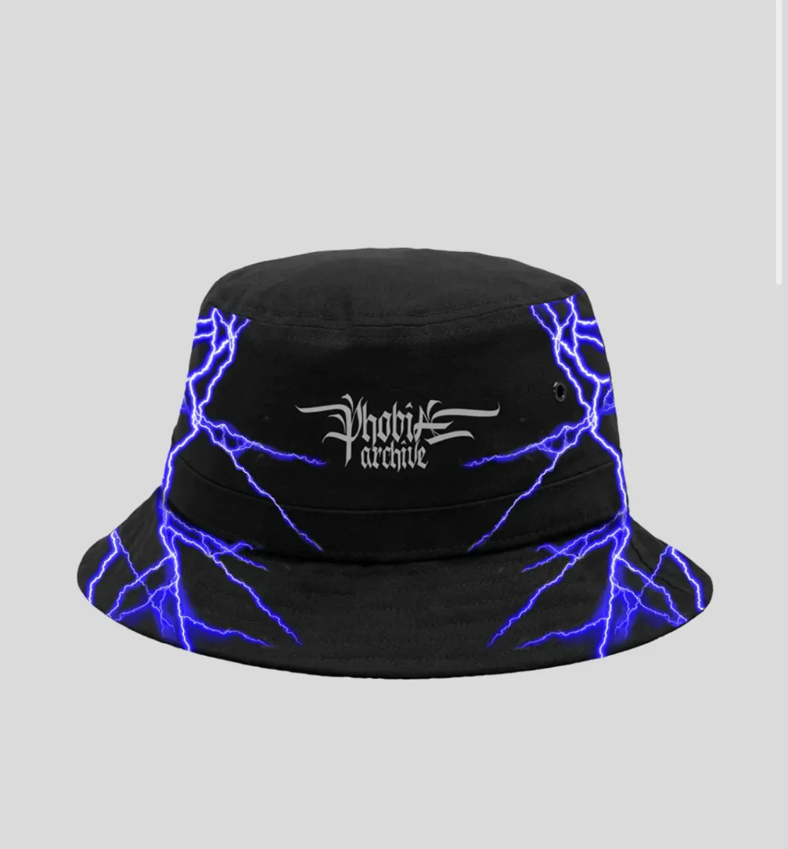 Cappello bucket nero con fulmini in stampa serigrafica blu e logo ricamato