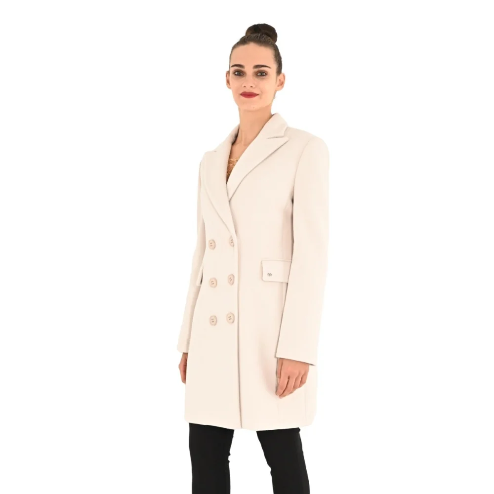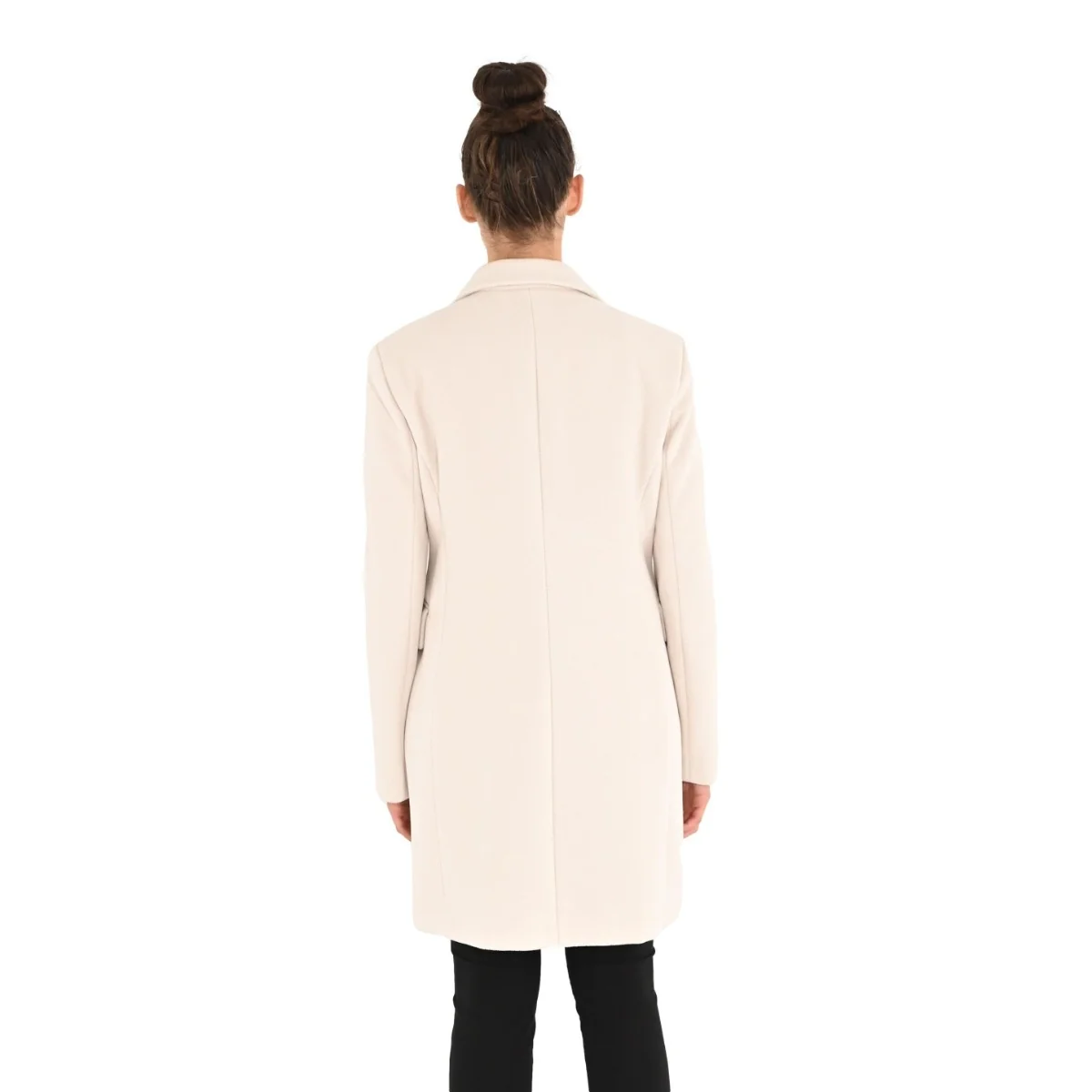 Cappotto corto Please da donna in panno stretch di misto poliestere e viscosa, modello doppiopetto a sei bottoni, con fodera a contrasto colore, revers classici e tasche laterali a filo con micro monogramma in metallo cucito a lato
