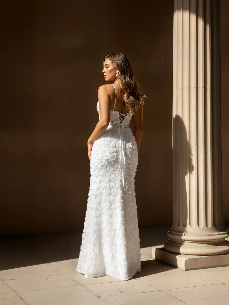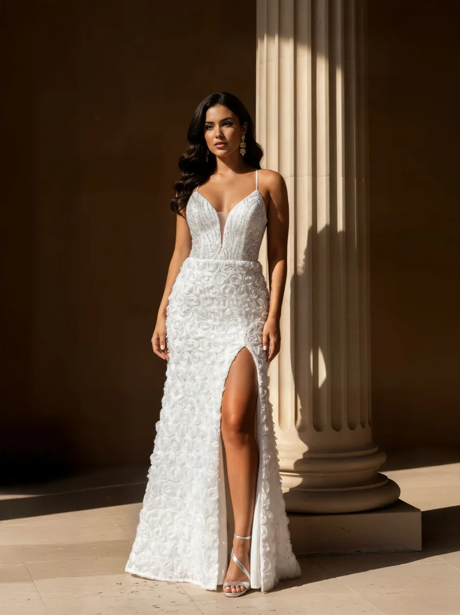 Modello: Abito lungo stile sirena, con corpetto a bustier e applicazioni floreali tridimensionali che ne fanno un capo di grande impatto visivo. Lo scollo a V profondo, sostenuto da stecche interne e inserti trasparenti, valorizza il décolleté, mentre le spalline sottili e regolabili donano leggerezza e armonia alla linea. La gonna aderente, interamente rivestita da roselline 3D in tessuto, segue le curve con eleganza e si apre in uno spacco frontale che slancia la figura, aggiungendo un tocco sensuale e raffinato. La chiusura a corsetto sulla schiena permette una vestibilità regolabile e definita, assicurando comfort e sostegno anche nelle taglie più strutturate. Un abito perfetto per cerimonie, eventi serali, feste di gala o occasioni formali, dove eleganza e personalità si incontrano.