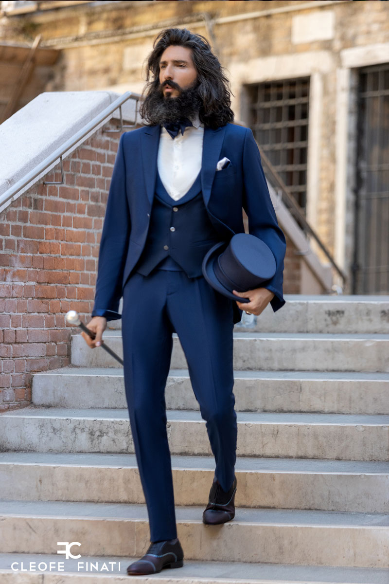 Per modellare ancora di più il tuo corpo, contenere perfettamente la camicia e giocare con i colori del panciotto, una cintura fasciante in broccato, 100% seta blu navy, per abito da sposo made in Italy 100%.