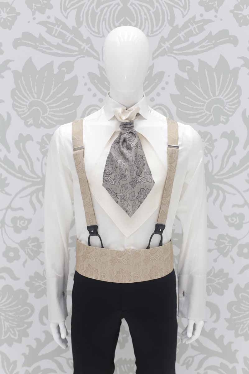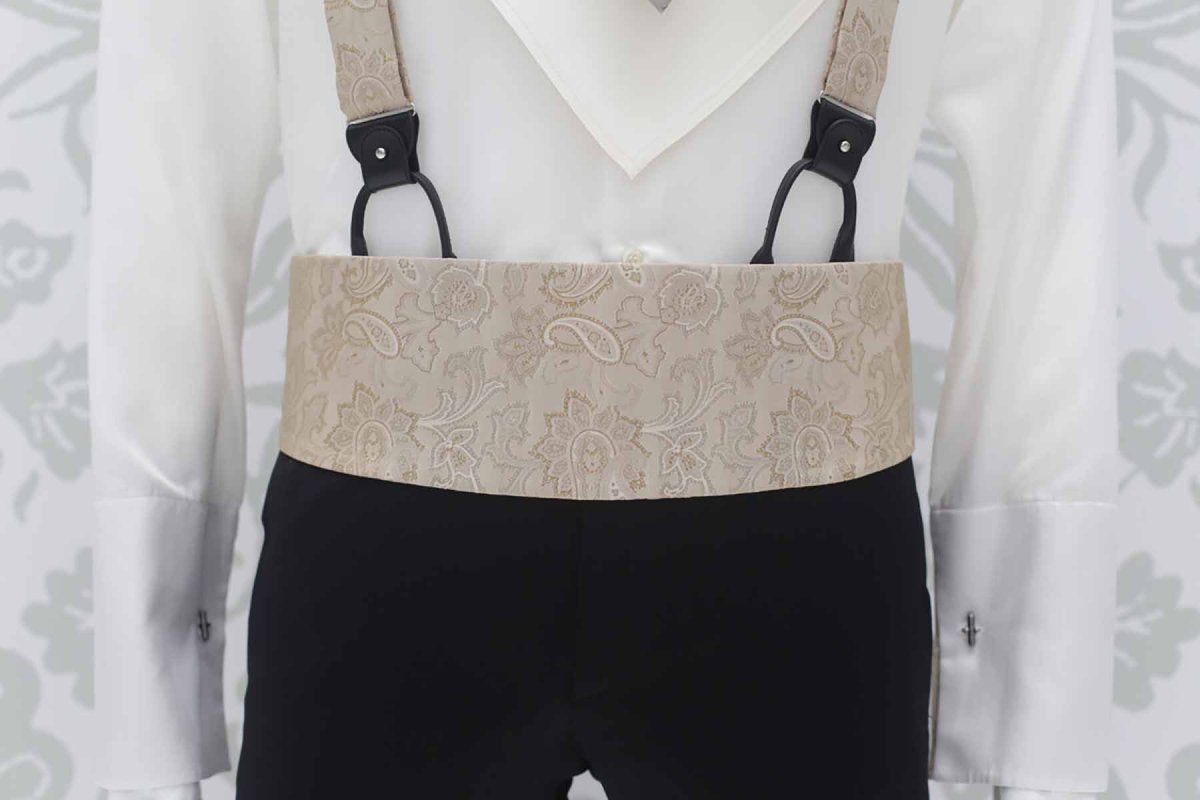 Per modellare ancora di più il tuo corpo, contenere perfettamente la camicia e giocare con i colori del panciotto, una cintura fasciante in broccato, 100% seta, in una calda nuance dorata, per abito da sposo made in Italy 100%.