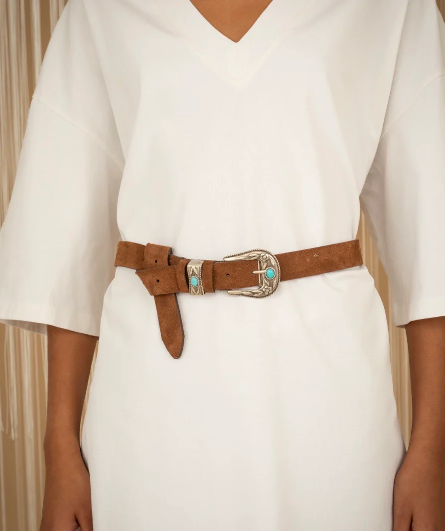 Cintura western in scamosciato marrone, con fibbia decorativa in argento sbalzato e pietre turchesi incastonate.
