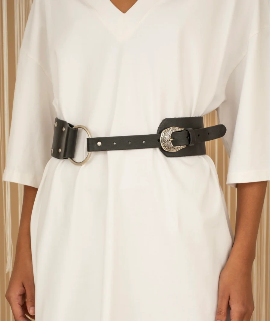 Cintura nera asimmetrica, composta da una fascia larga con borchie, un grande anello metallico laterale e una chiusura sottile con fibbia argentata lavorata.