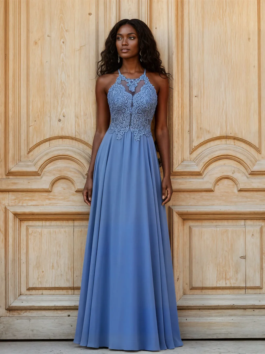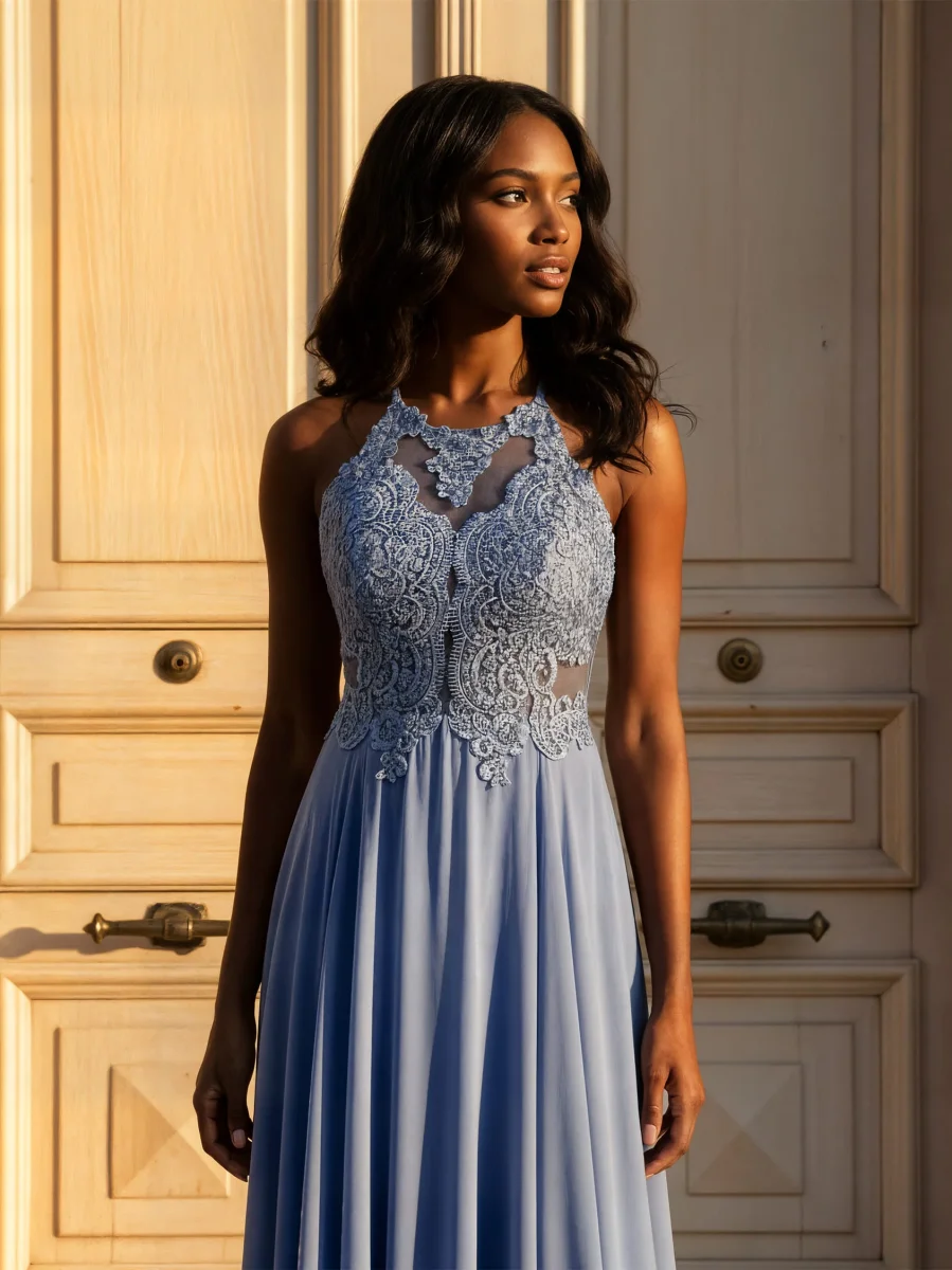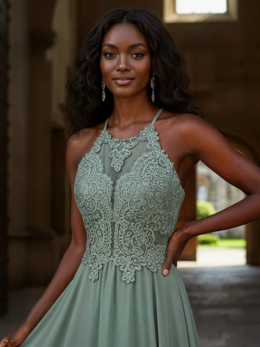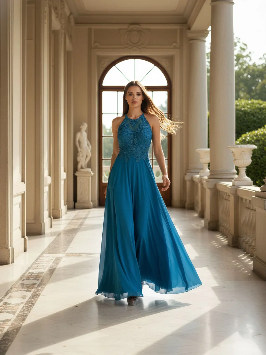 Modello: Abito lungo da cerimonia con corpetto in pizzo ricamato e schiena scoperta. Il corpino in pizzo ricamato con applicazioni floreali valorizza il décolleté con un raffinato gioco di trasparenze, mentre la scollatura all’americana e la schiena scoperta conferiscono un tocco moderno e sensuale. La gonna in chiffon leggero cade morbida fino a terra, creando movimento ad ogni passo e regalando una silhouette slanciata e fluida. La fascia arricciata in vita esalta le forme senza stringere, garantendo comfort per tutta la durata dell’evento. Un abito pensato per cerimonie, matrimoni ed eventi serali, ideale per chi cerca uno stile sofisticato ma al tempo stesso fresco e contemporaneo.