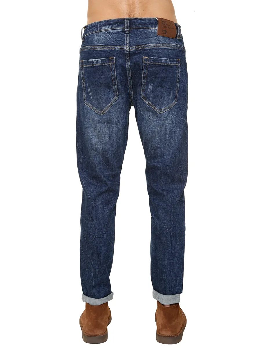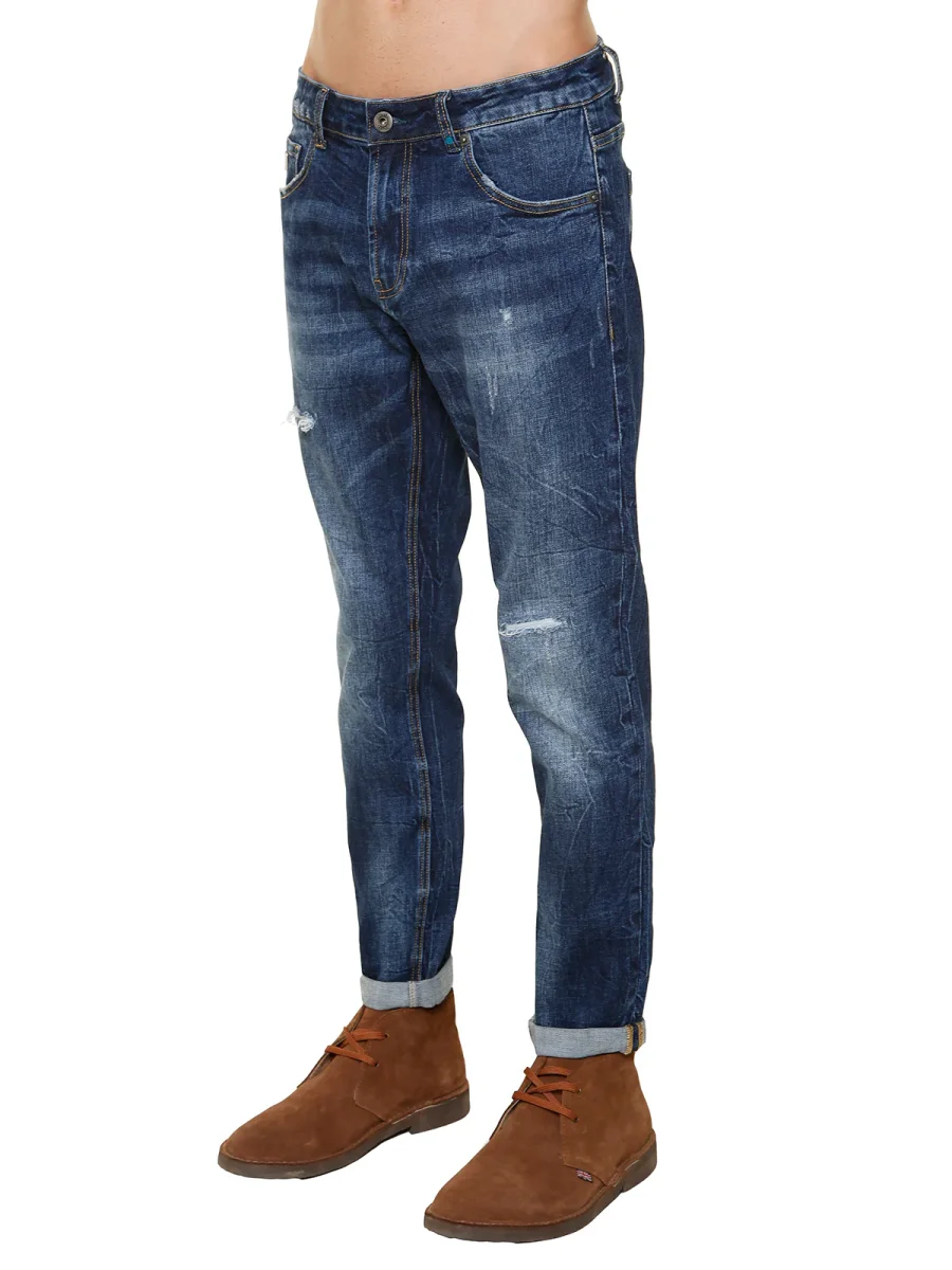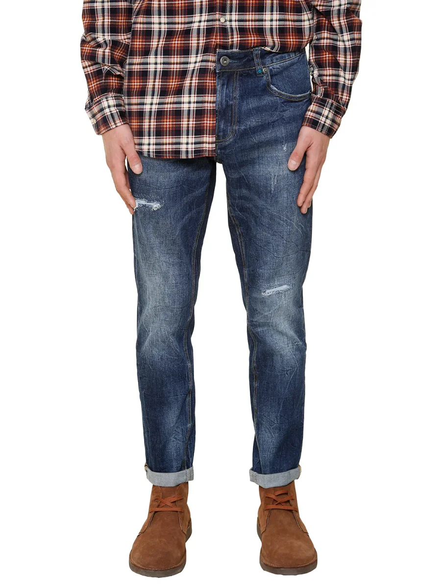Modello 5 tasche in denim effetto délavé – Vestibilità regular – Vita media con passanti – Chiusura con bottone e zip – Targhetta logo sul taschino anteriore – Etichetta logo posteriore destra – Dettaglio rotture e graffiature – Blu scuro – Colore unico – Composizione 99%CO 1%EA