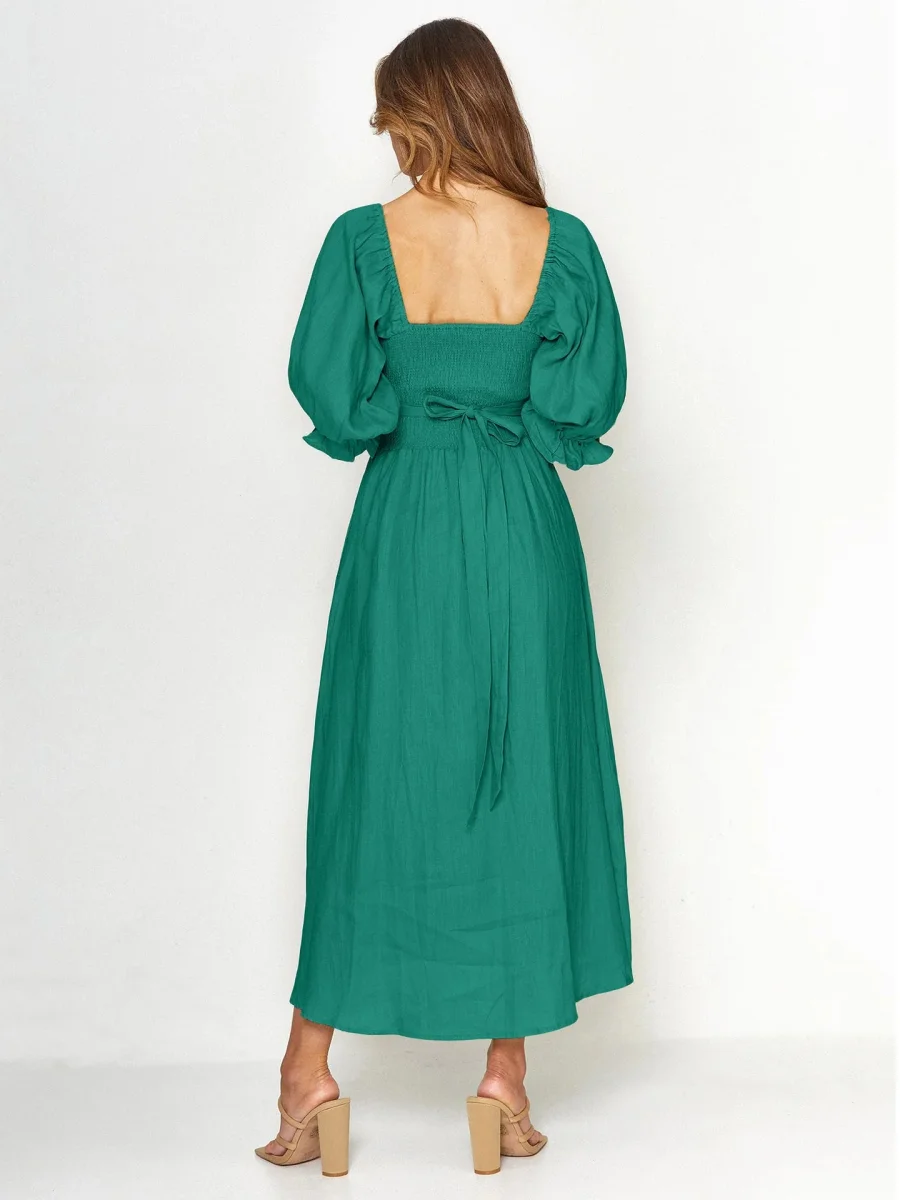 Incanta con questo abito midi dalle maniche a sbuffo e scollo quadrato. Il fiocco versatile, annodabile sia davanti che dietro, aggiunge un tocco di eleganza personalizzabile.