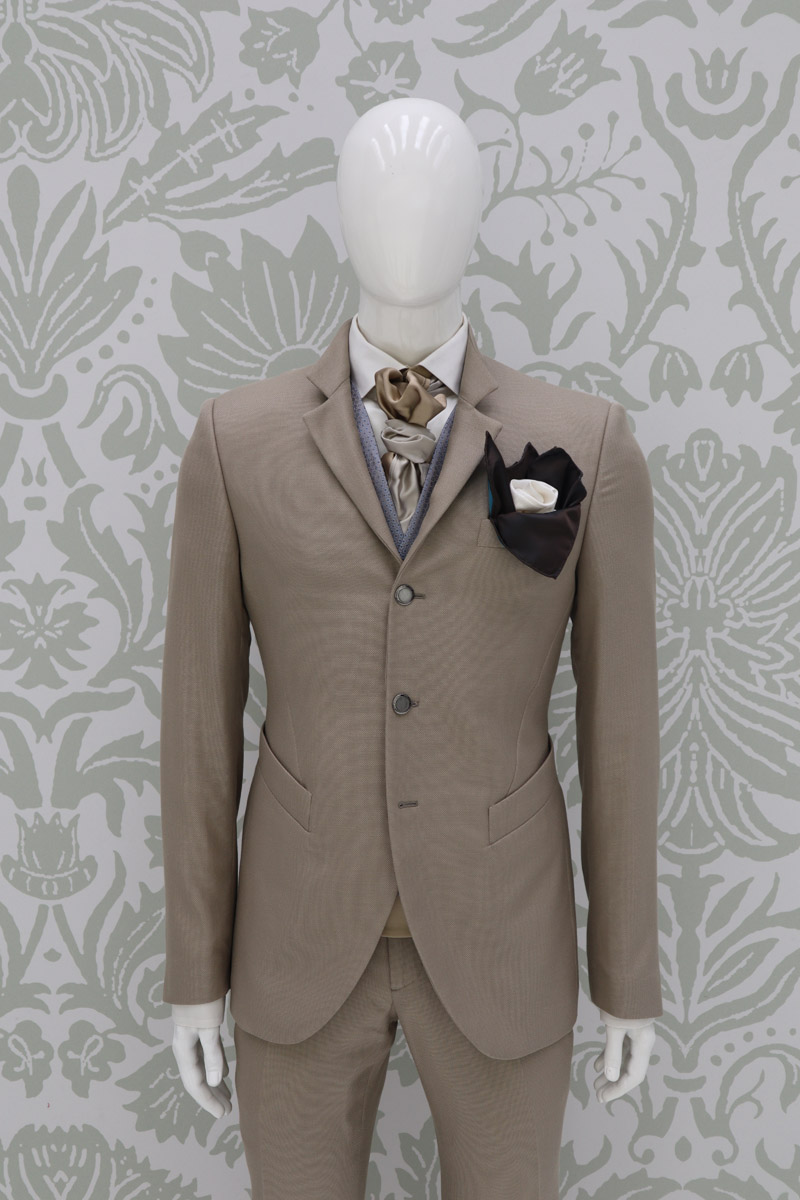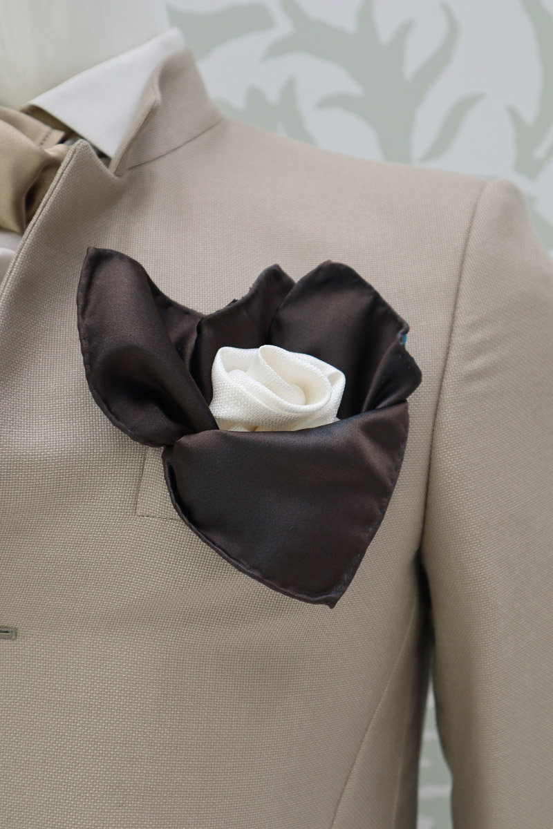 Per un tocco di estrema eleganza, a completare l’abito, una doppia pochette rifinita con estrema cura e precisione in orlo a rotolino; la prima in raso, 100% seta, bianco latte, coronata da una seconda in raso 100% seta marrone.