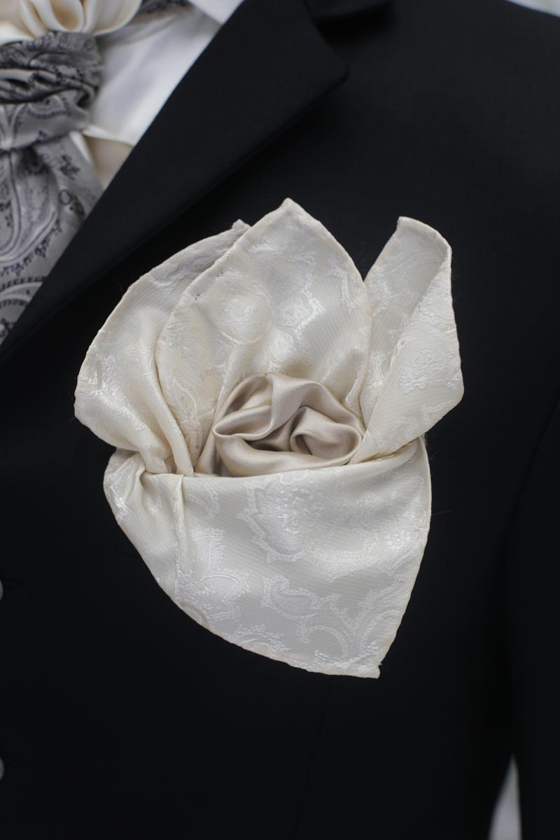 Doppio fazzoletto da sposo, una pochette in broccato 100% seta panna con disegno jacquard tono su tono ed una, di un beige dorato luminoso in seta 100%. Luce e colore per completare un total look che diviene magia. Seta 100%.
