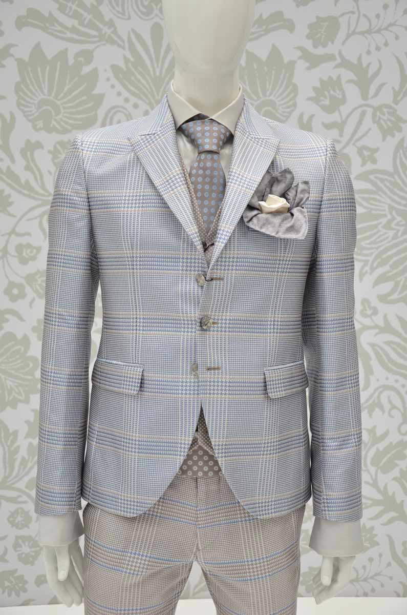 Per un tocco di estrema eleganza, a completare l’abito, una doppia pochette rifinita con estrema cura e precisione in orlo a rotolino; la prima in un raso di seta 100% bianco latte, coronata da una seconda pochette in broccato 100% seta sabbia sorpreso da micro disegni paisley disegnati da un effetto a mille righe orizzontali azzurre.