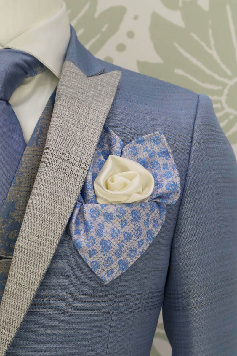 Per un tocco di estrema eleganza, a completare l’abito, una doppia pochette rifinita con estrema cura e precisione in orlo a rotolino; la prima in broccato 100% seta dal fondo bianco silver, solcata da micro disegni floreali azzurro acceso, coronata da una seconda in raso 100% seta bianco ottico per un tocco di luce.