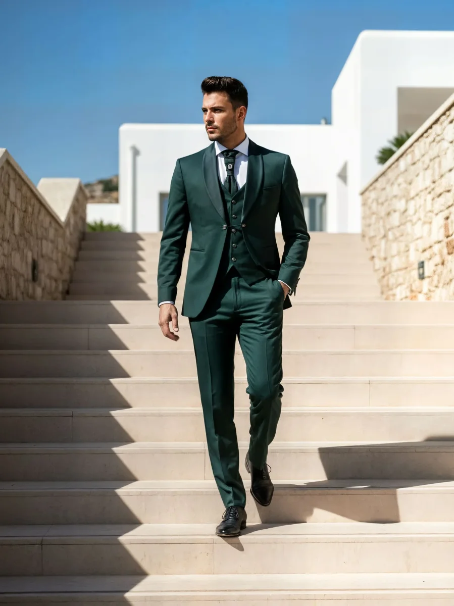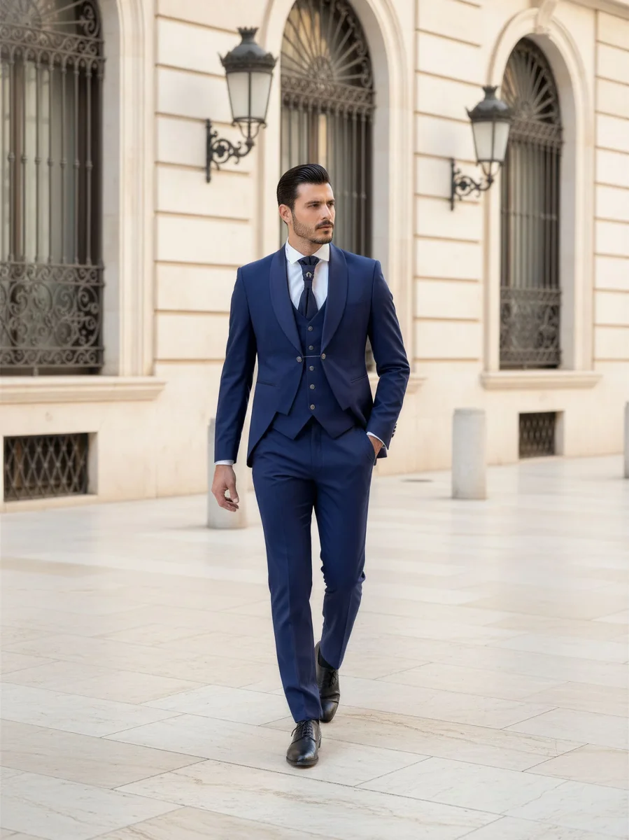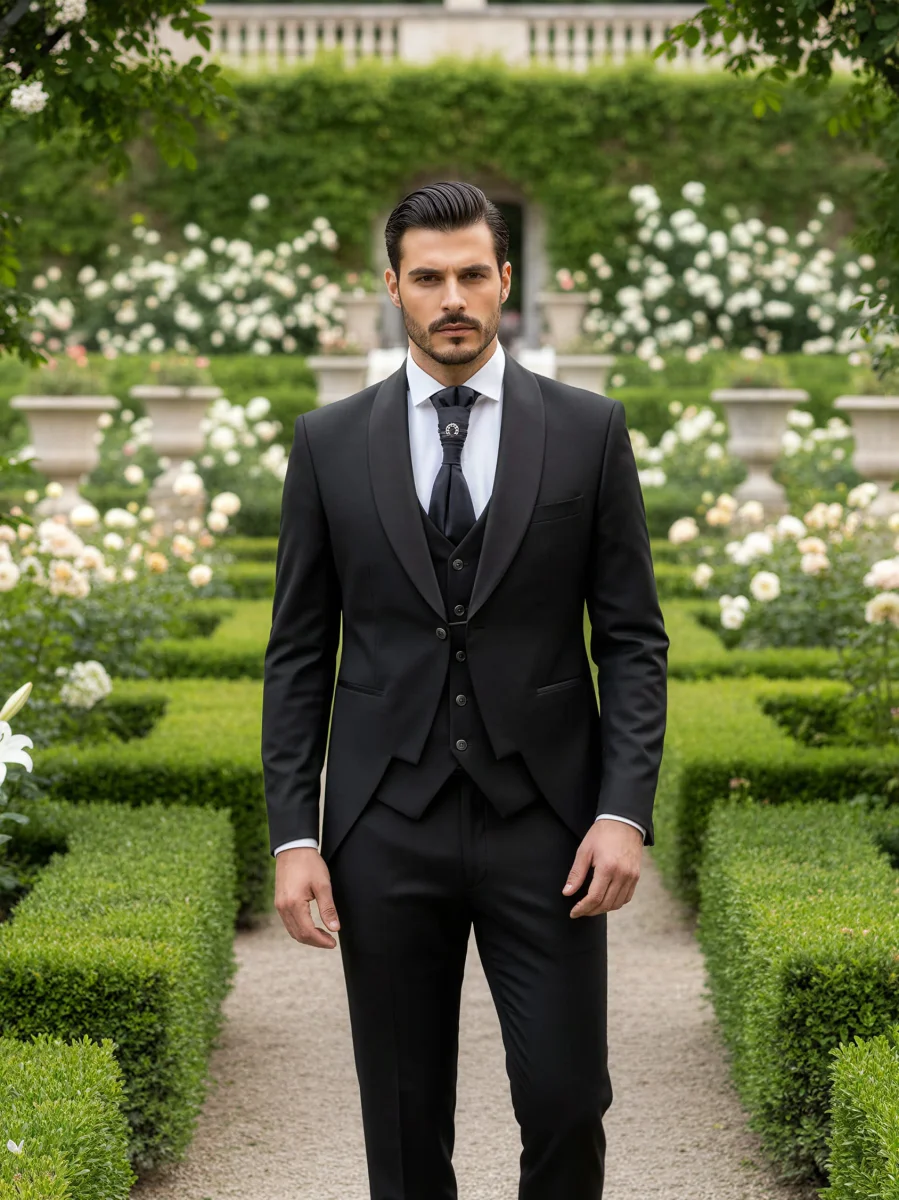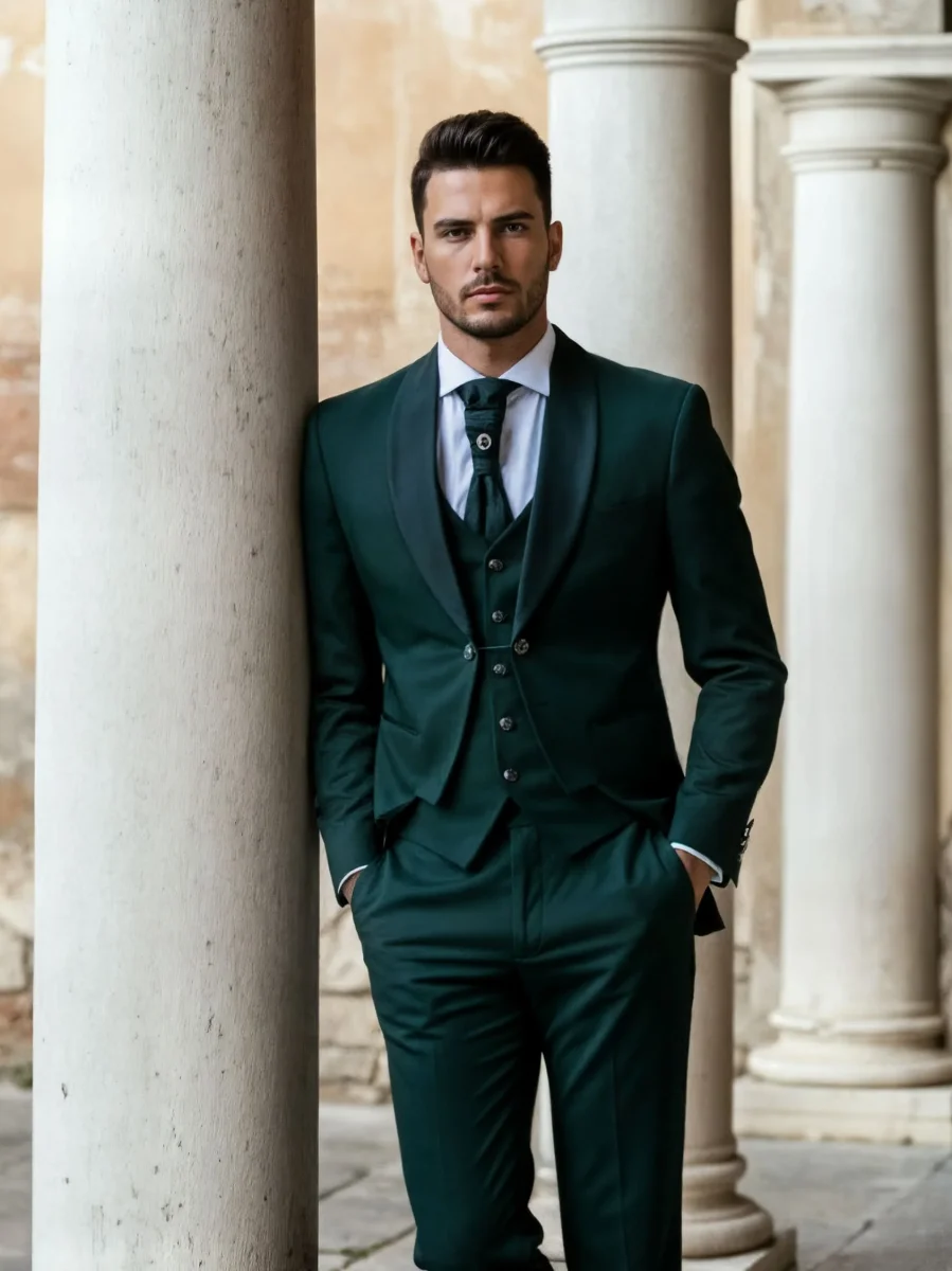 Modello: Un abito da sposo che unisce eleganza e personalità, ideale per il giorno più speciale. La giacca, con il rever a scialle in raso lucido e una silhouette moderna, trasmette una raffinatezza intramontabile. Il panciotto, perfettamente coordinato, aggiunge profondità al look grazie ai suoi dettagli sartoriali impeccabili. Il pantalone, dal taglio classico, completa l’outfit con una linea pulita e un tessuto che riflette luce con discrezione. Un completo che celebra lo stile e la classe senza compromessi.