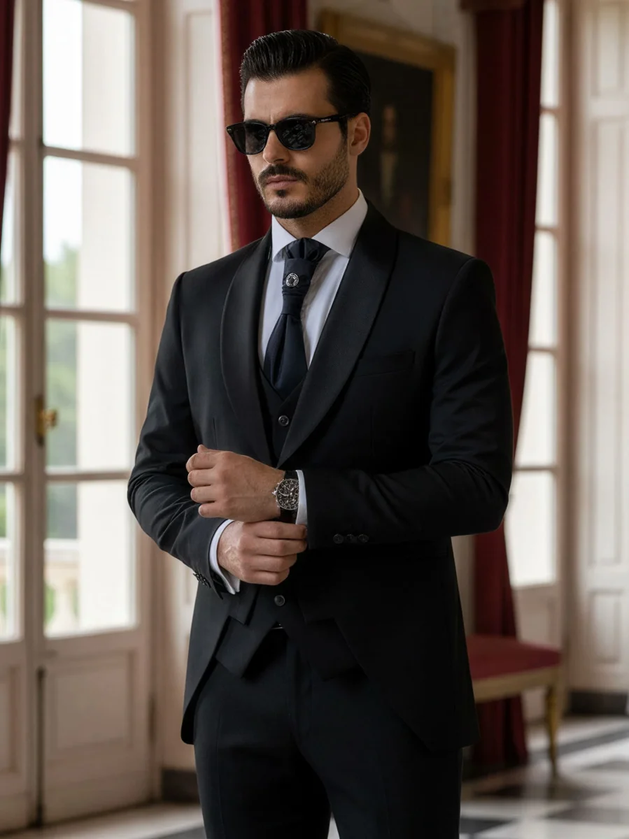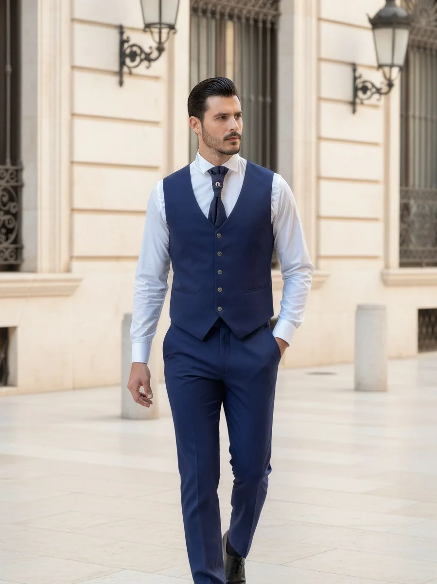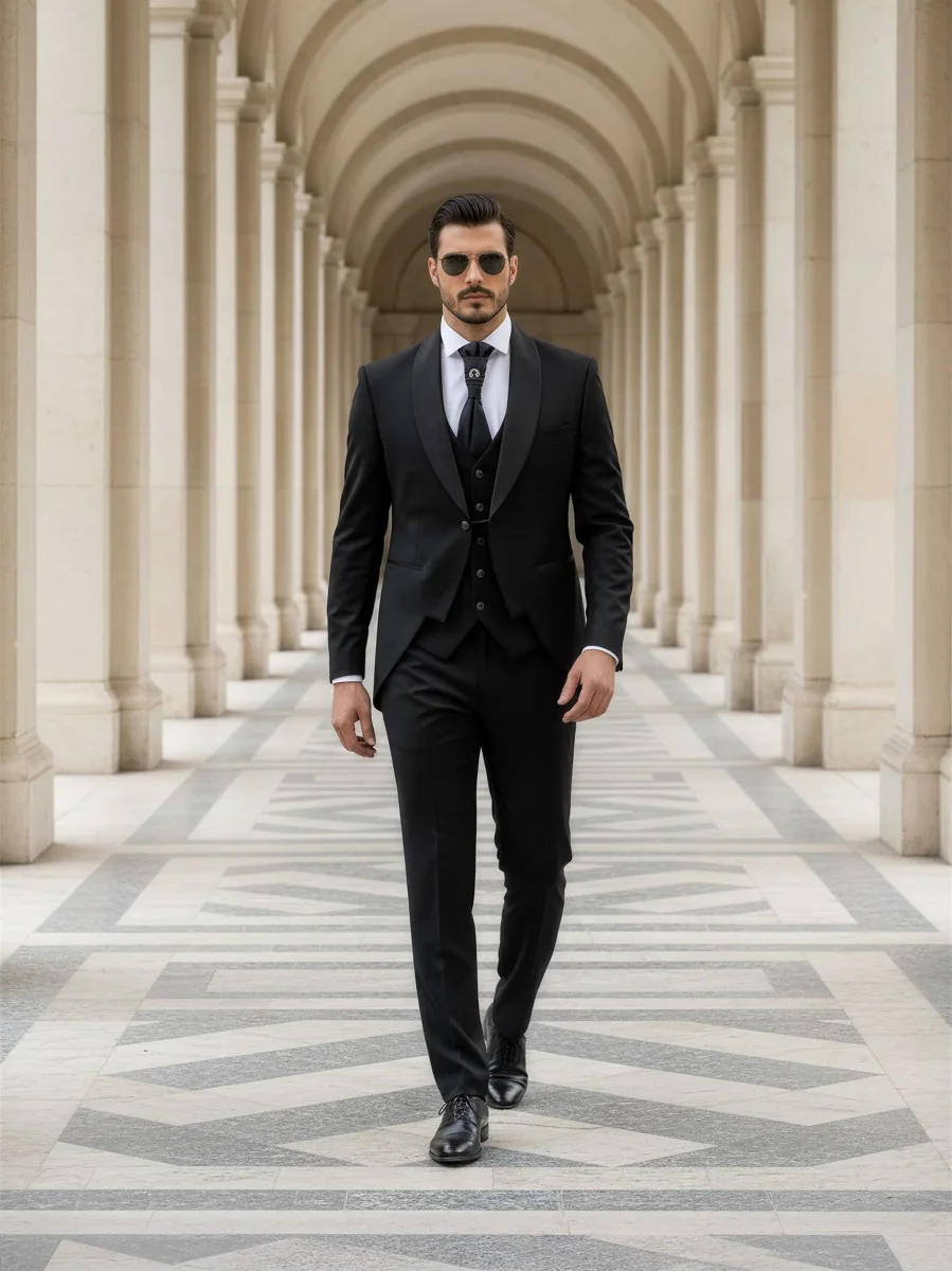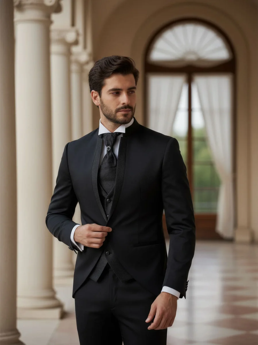 Modello: Un abito da sposo che unisce eleganza e personalità, ideale per il giorno più speciale. La giacca, con il rever a scialle in raso lucido e una silhouette moderna, trasmette una raffinatezza intramontabile. Il panciotto, perfettamente coordinato, aggiunge profondità al look grazie ai suoi dettagli sartoriali impeccabili. Il pantalone, dal taglio classico, completa l’outfit con una linea pulita e un tessuto che riflette luce con discrezione. Un completo che celebra lo stile e la classe senza compromessi.