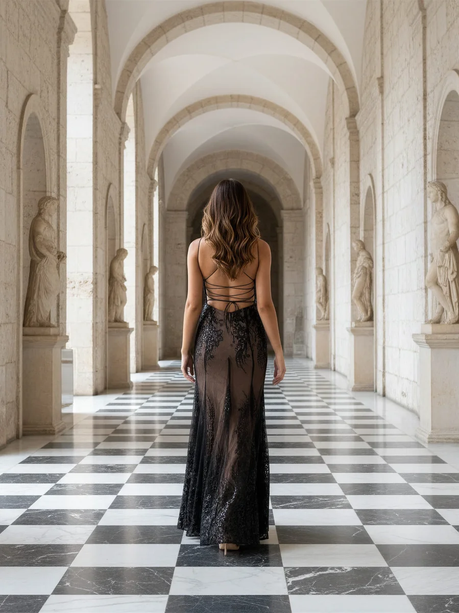 Modello: Abito a sirena in tulle ricamato con paillettes e microperline nere, pensato per chi desidera un’eleganza sensuale ma raffinata. Il corpetto con scollo a cuore e spalline sottili esalta la silhouette, mentre la schiena scoperta con incrocio di nastri dona leggerezza e fascino. La base color nude, in contrasto con il ricamo nero, crea un effetto trasparenza che scolpisce le linee del corpo con equilibrio e carattere. La gonna segue la figura fino al ginocchio e si apre dolcemente verso il fondo, offrendo un movimento fluido e sofisticato. Un abito che unisce sensualità e struttura, per una presenza magnetica in ogni contesto elegante.