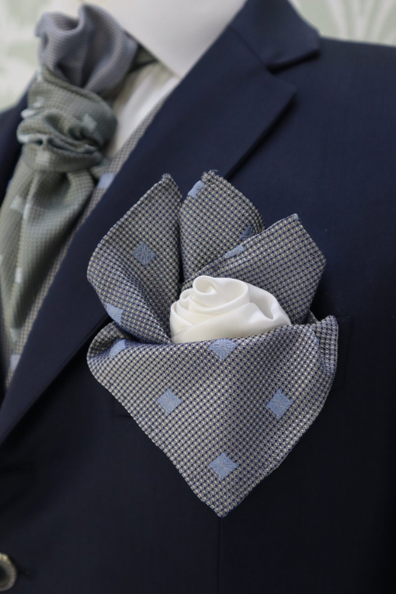 Fazzoletto da cerimonia uomo Cleofe Finati in grigio perla- blu polvere / bianco avorio, elegante e sartoriale in perfetto abbinamento con il colore dell’abito della sposa.