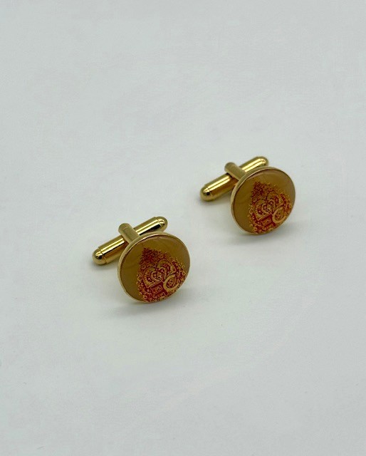 Gemelli da cerimonia uomo Cleofe Finati, colo oro con motivo ornamentale rosso smaltato a mano. Il gemello serve a completare la camicia e l’abito da sposo con eleganza.
