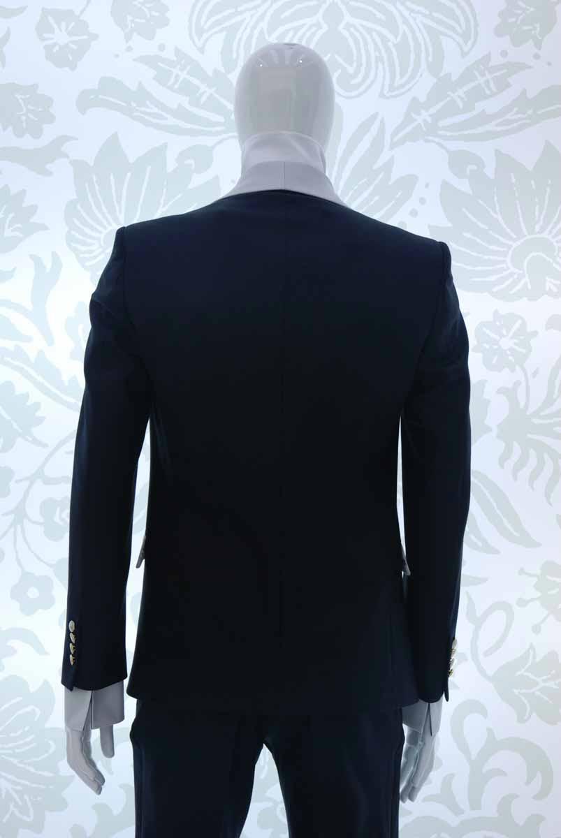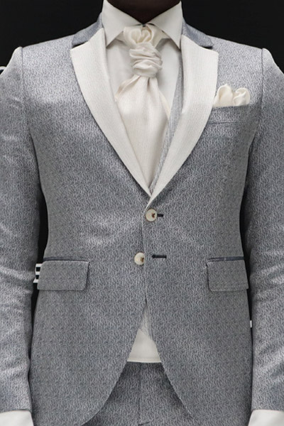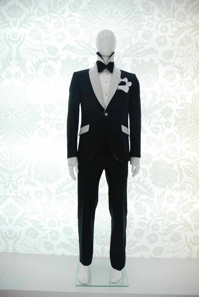 Ammira il gioco di chiaro scuro di giacca dal corpo nero, esaltato da revers, taschino e tasche a pattina inserite in contrasto bianco silver dall’effetto perlato.; questo modello disegna perfettamente le linee del tuo corpo, slanciando la figura. Abito da uomo da indossare in qualunque occasione, anche successivamente al matrimonio, che ti permette di essere un uomo dandy ogni volta che lo desideri.