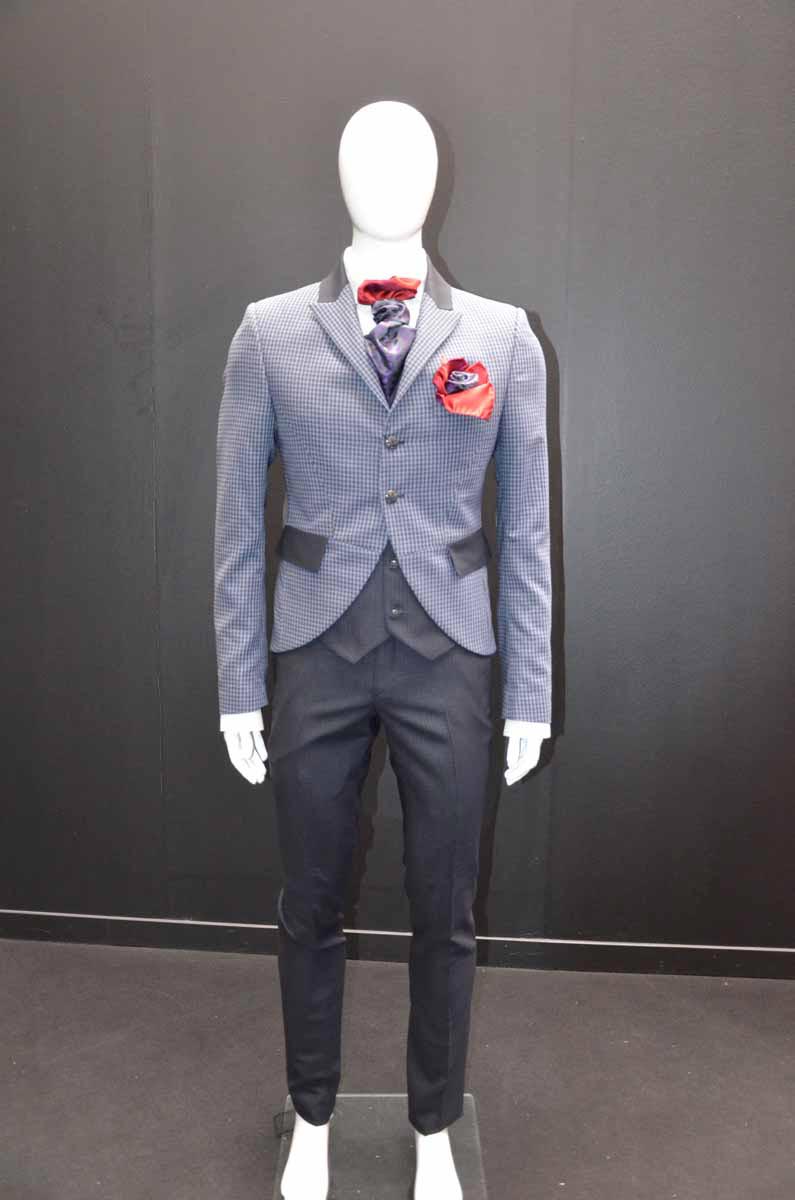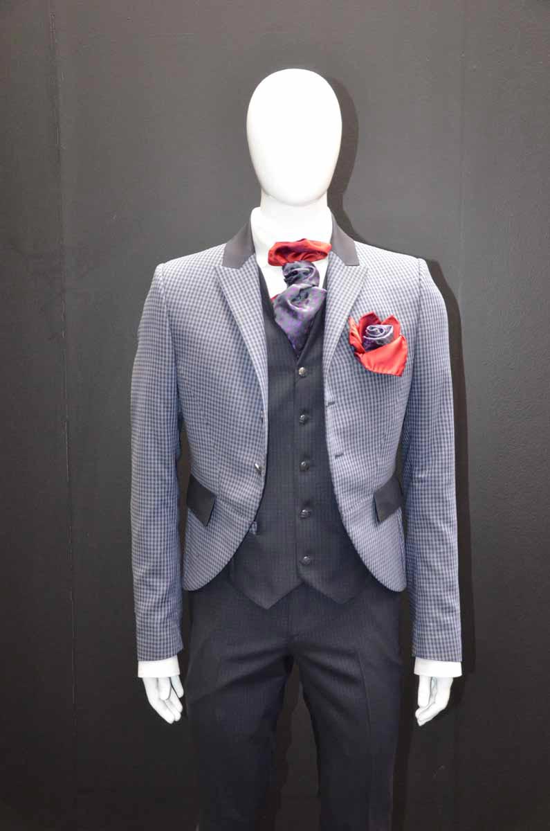 L’outfit si esprime su toni blu e grigi, che introduce un secondo tessuto blu notte per le applicazioni quali sopracollo e tasche a patta che enfatizzano il punto vita; questo modello disegna perfettamente le linee del tuo corpo, slanciando la figura. Abito da uomo da indossare in qualunque occasione, anche successivamente al matrimonio, che ti permette di essere un uomo dandy ogni volta che lo desideri.