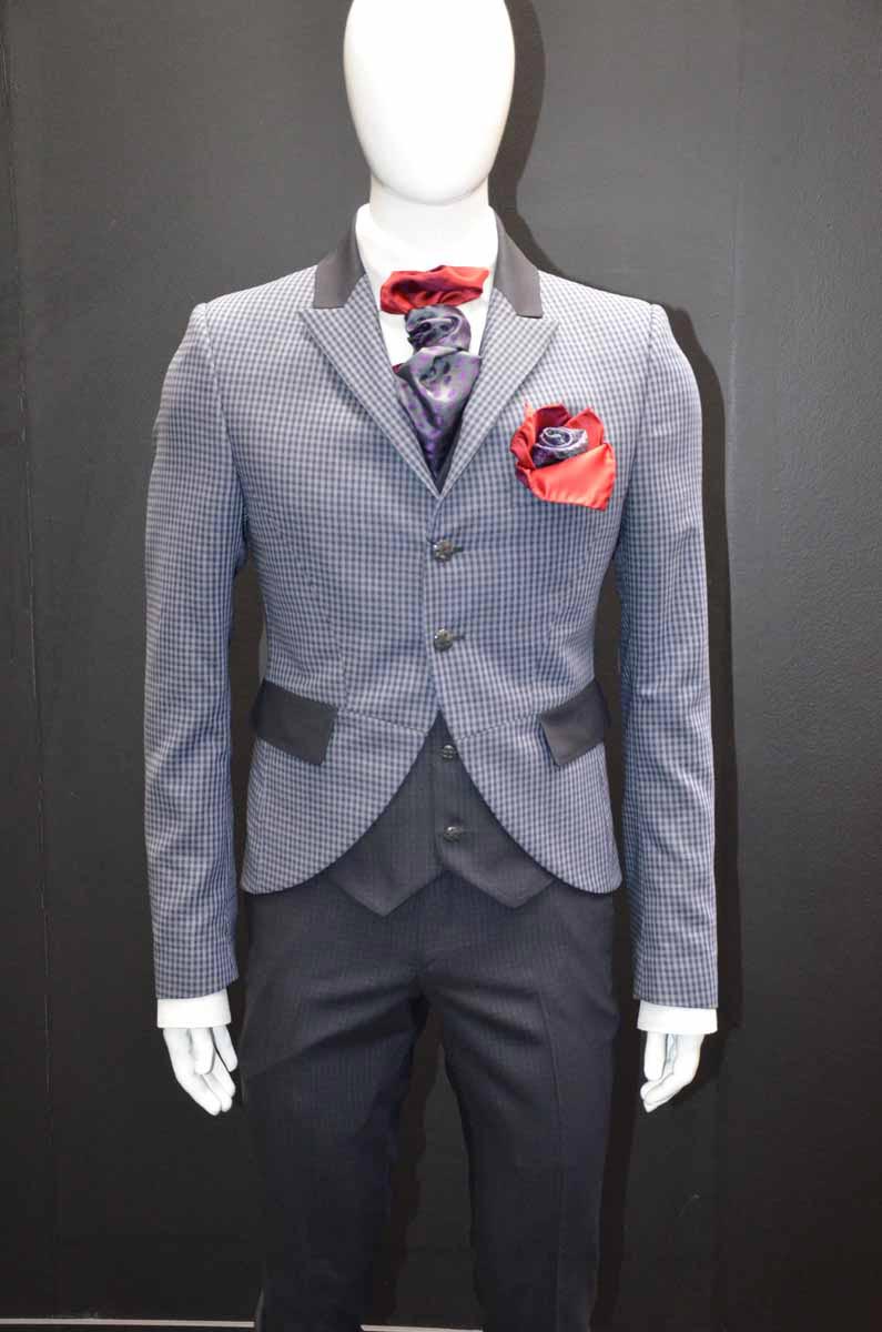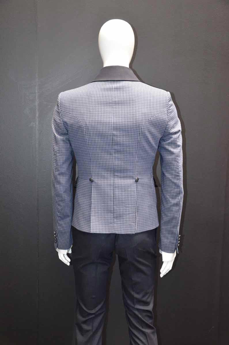 Giacca abito da uomo lusso glamour in tessuto con fantasia Vichy. Linea moda fashion, unite da eccellenza sartoriale danno vita a questo modello di giacca assolutamente innovativo, reinventato dalla giacca di Charlie Chaplin: cortissima, monopetto a due bottoni, con collo con punta a lancia.
