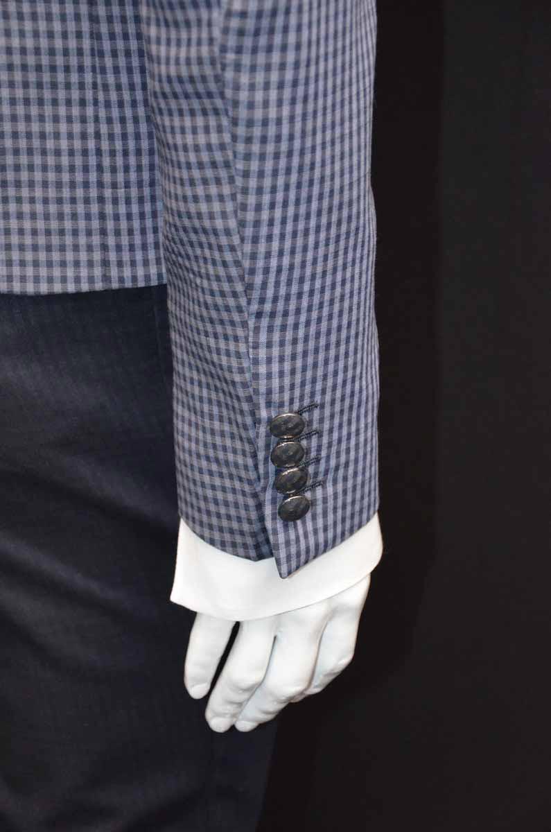 - Corpo giacca: tessuto accoppiato micro quadrettato su toni blu e grigi