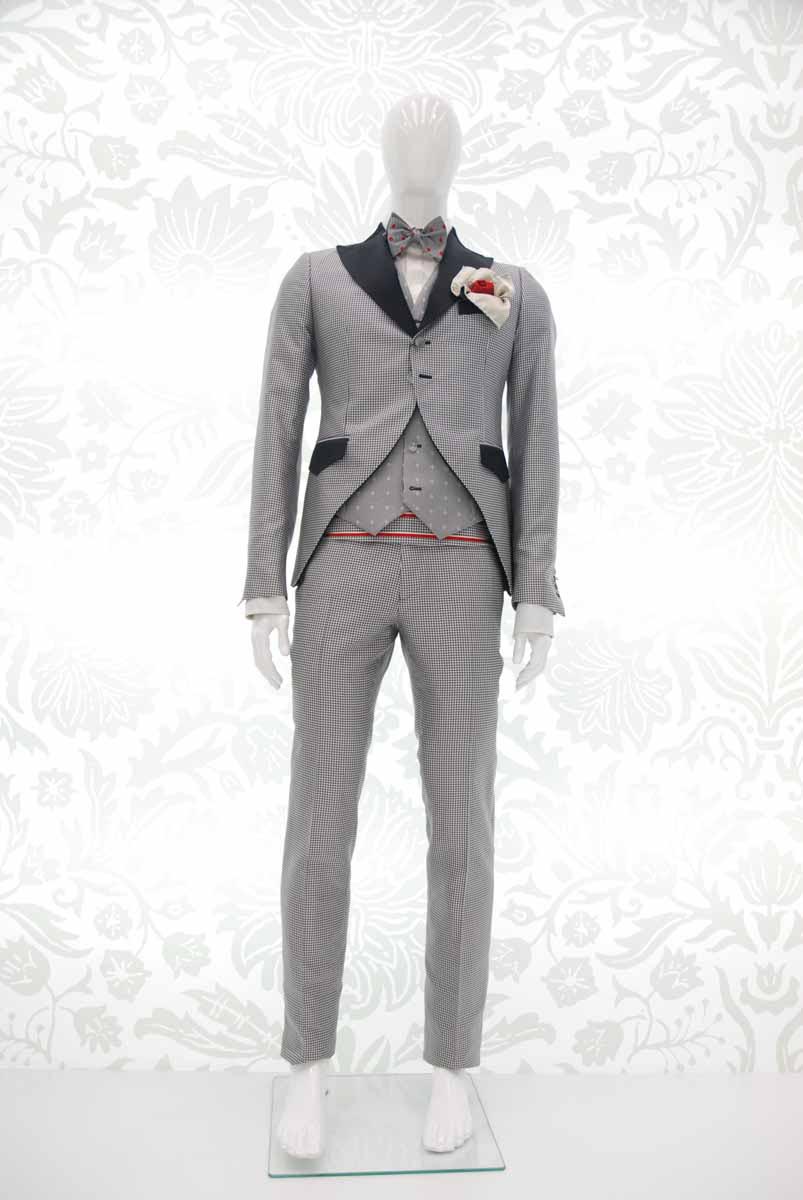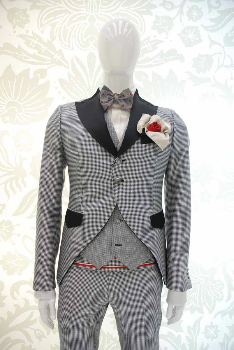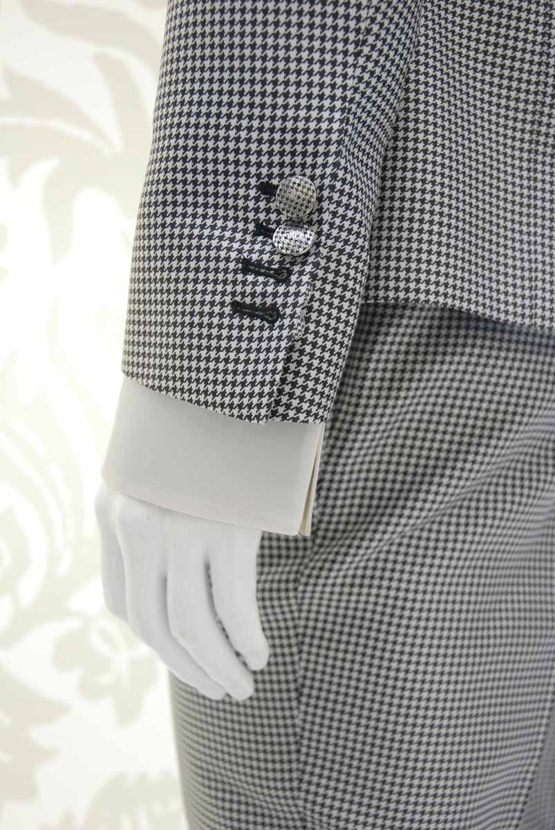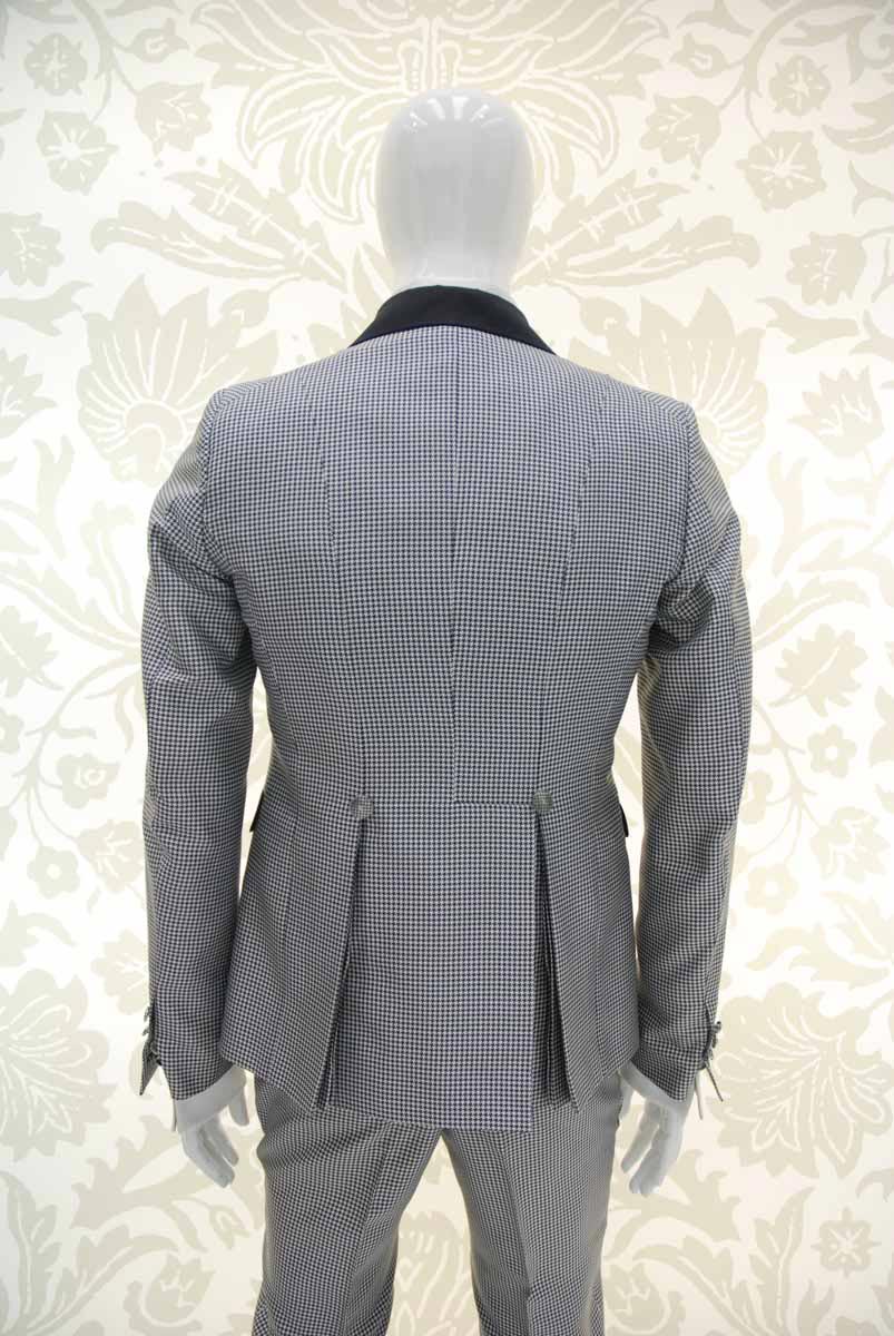 Corpo giacca in broccato 100% seta con micro disegno Pied de Poule che intreccia fili bianchi e neri, abbinato ad un raso 100% seta nero su sopracollo, rever, tasche a pattina e taschino; questo modello disegna perfettamente le linee del tuo corpo, slanciando la figura. Abito da uomo da indossare in qualunque occasione, anche successivamente al matrimonio, che ti permette di essere un uomo dandy ogni volta che lo desideri.