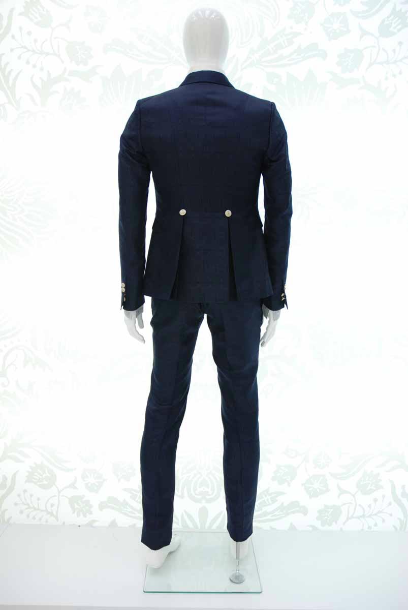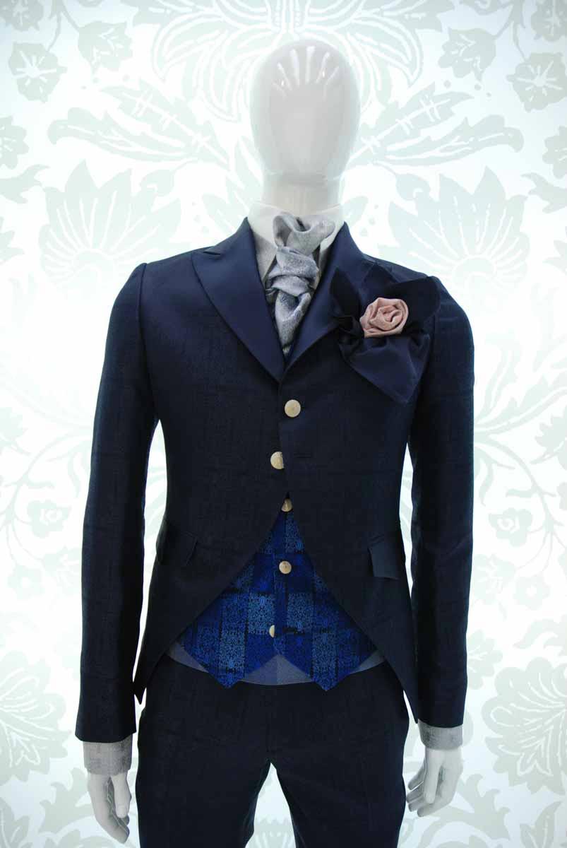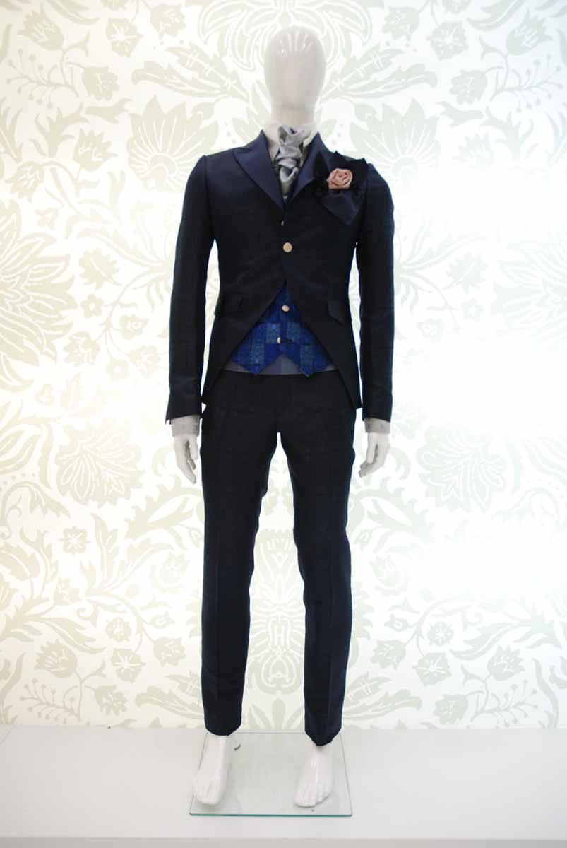 Corpo giacca in broccato 100% seta blu notte solcato da fantasie tono su tono enfatizzate da  un raso 100% seta dello stesso blu su revers, tasche a patta e taschino; questo modello disegna perfettamente le linee del tuo corpo, slanciando la figura. Abito da uomo da indossare in qualunque occasione, anche successivamente al matrimonio, che ti permette di essere un uomo dandy ogni volta che lo desideri.