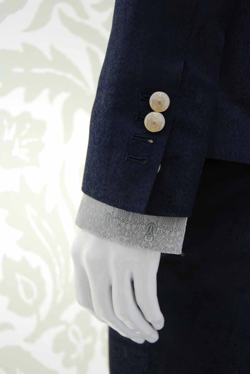 • Corpo giacca: broccato blu notte solcato da fantasie tono su tono