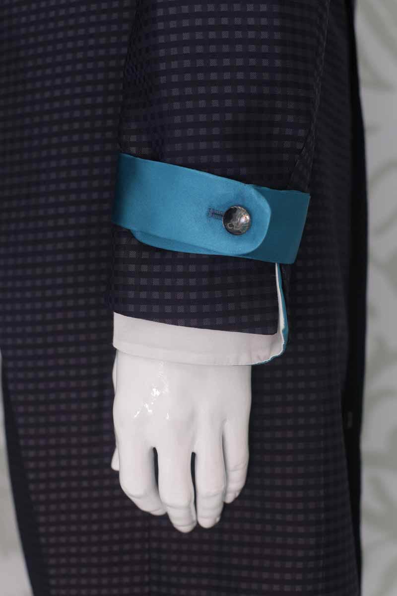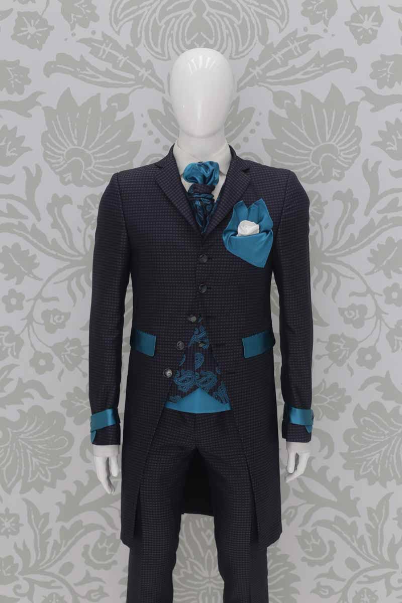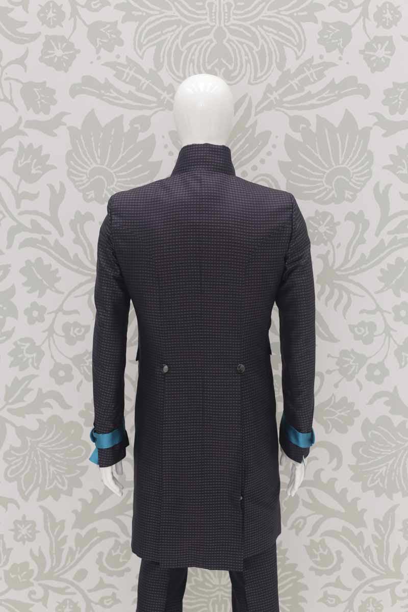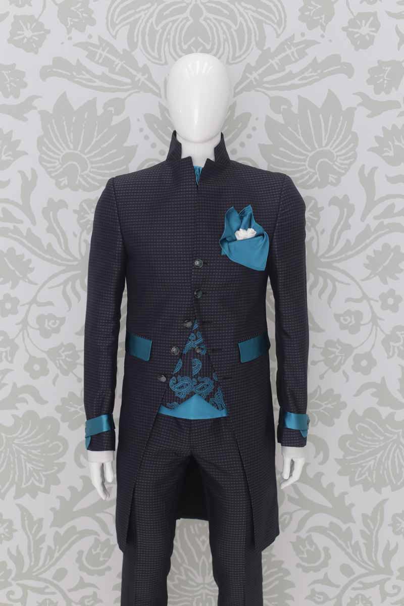 Corpo giacca in broccato 100% seta quadrettato, sui toni del grigio antracite blu, con applicazioni quali tasche, taschino e fascette sulle maniche in raso 100% seta azzurro turchese lucente; questo modello disegna perfettamente le linee del tuo corpo, slanciando la figura. Abito da uomo da indossare in qualunque occasione, anche successivamente al matrimonio, che ti permette di essere un uomo dandy ogni volta che lo desideri.