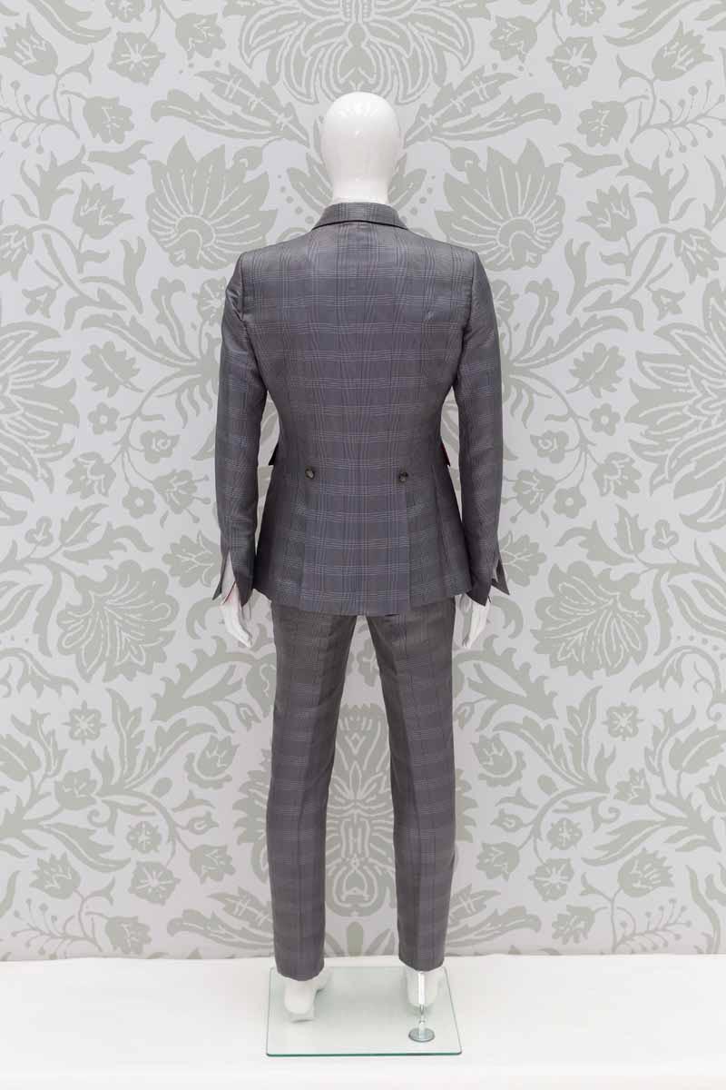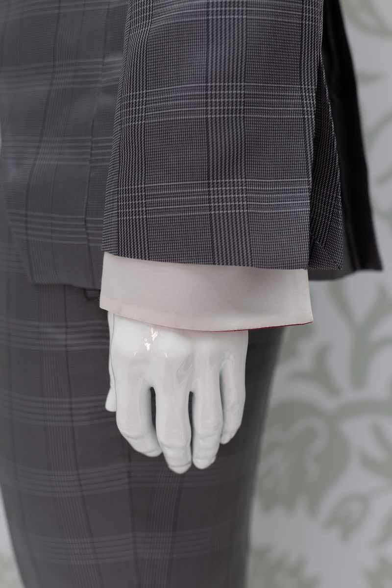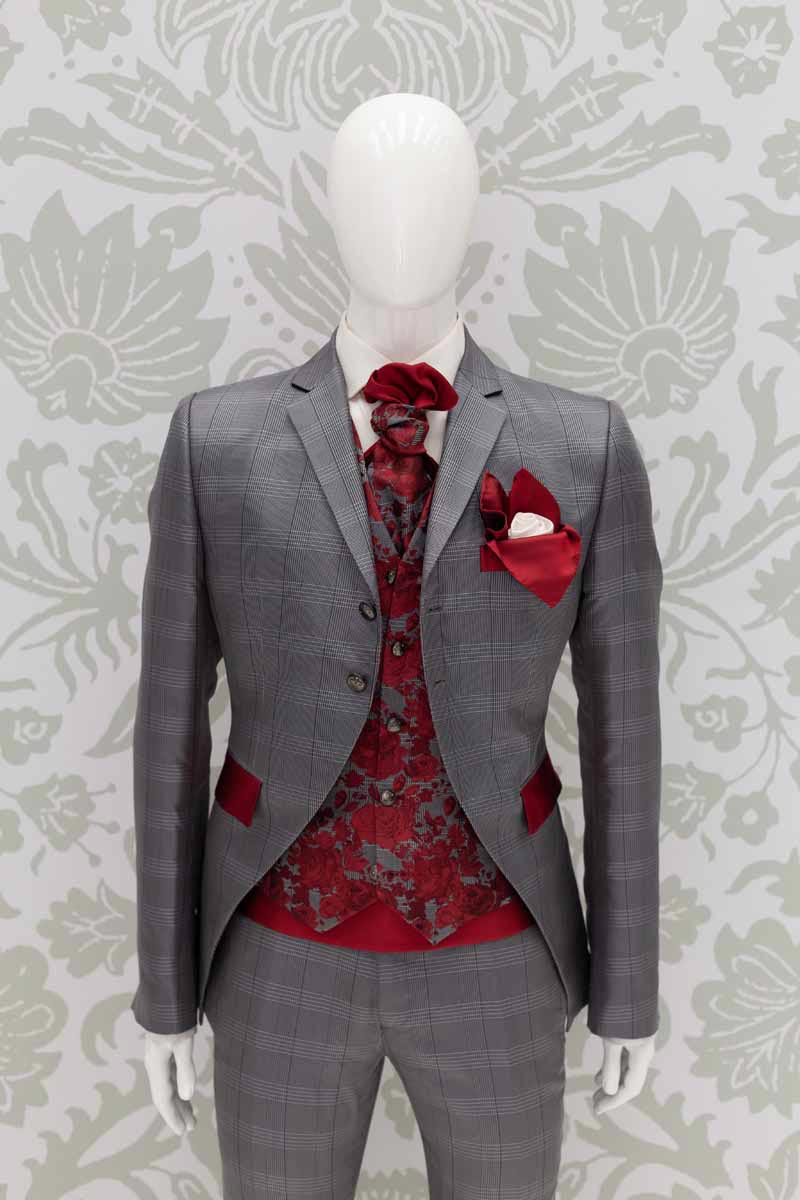 Corpo giacca in broccato 100% seta Principe di Galles 100% made in Italy, che intreccia fili bianchi neri e grigi, con applicazioni quali tasche e taschino in raso 100% seta rosso intenso; questo modello disegna perfettamente le linee del tuo corpo, slanciando la figura. Abito da uomo da indossare in qualunque occasione, anche successivamente al matrimonio, che ti permette di essere un uomo dandy ogni volta che lo desideri.