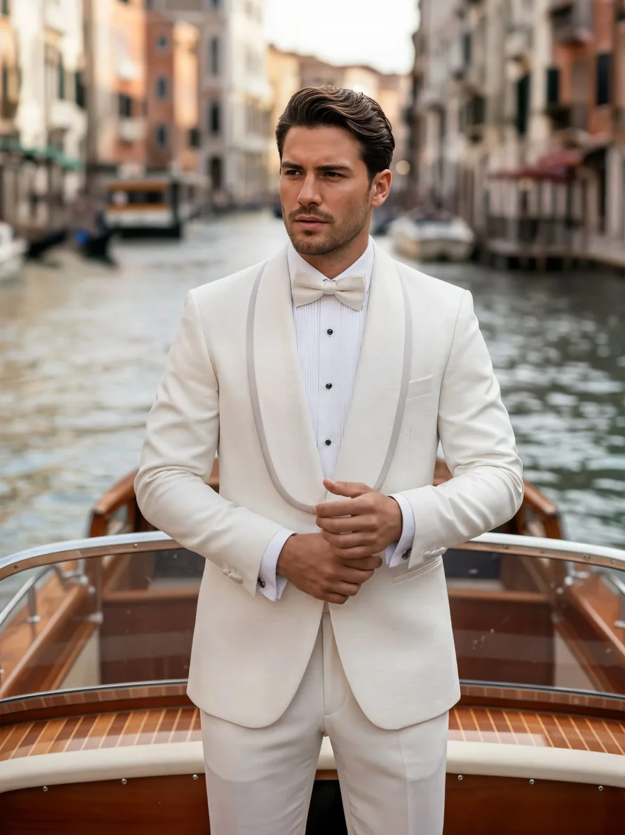 Modello: Giacca petto sciallato in raso. Particolarità della giacca è il tessuto glitterato in cui è realizzata, che le conferisce eleganza e luce. Ai polsini sono applicati bottoni in tessuto così da richiamare il rever, come la tasca a filo sul petto e sul busto.