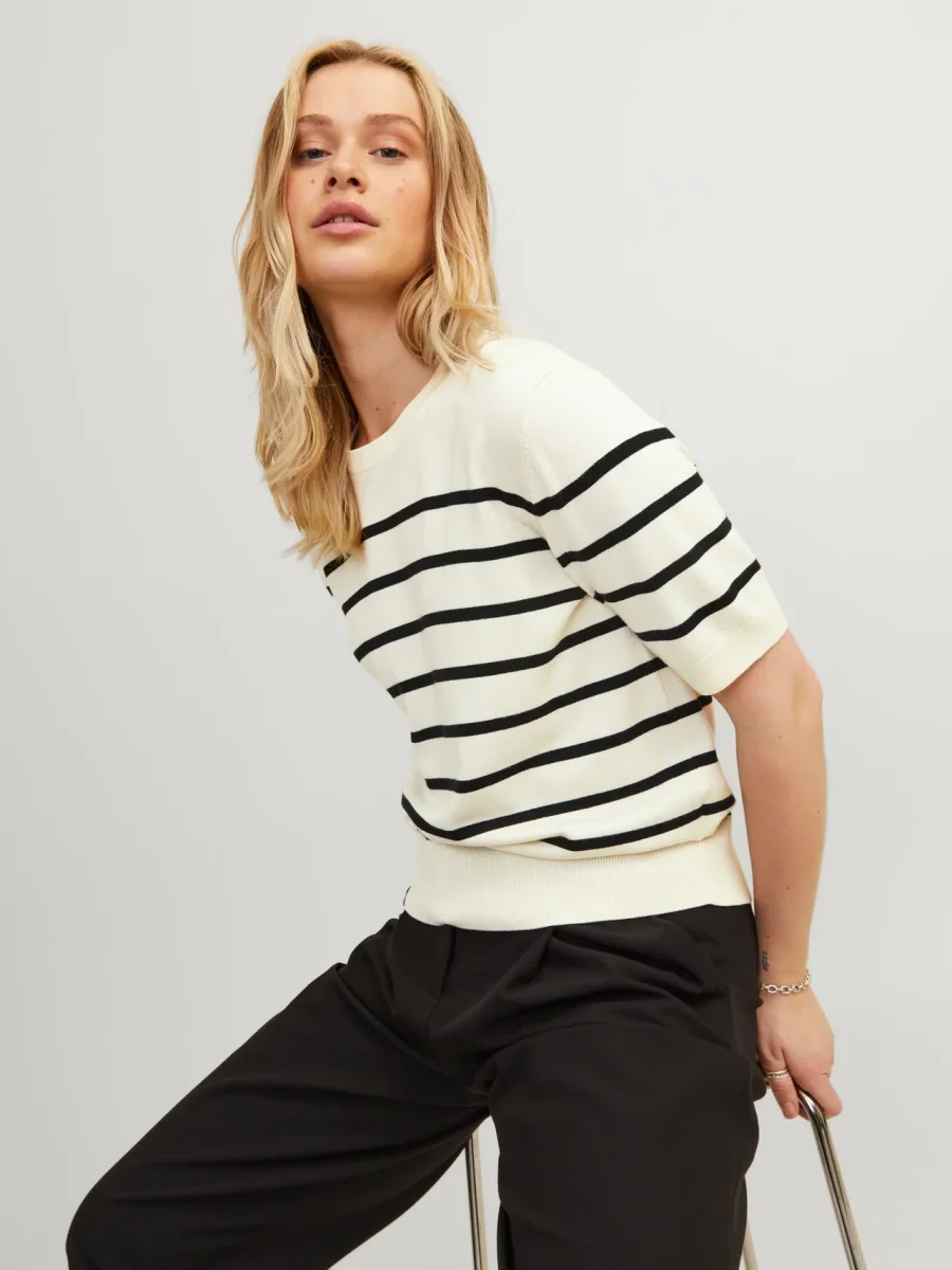 • Dettagli a righe su polsini, colletto e orlo