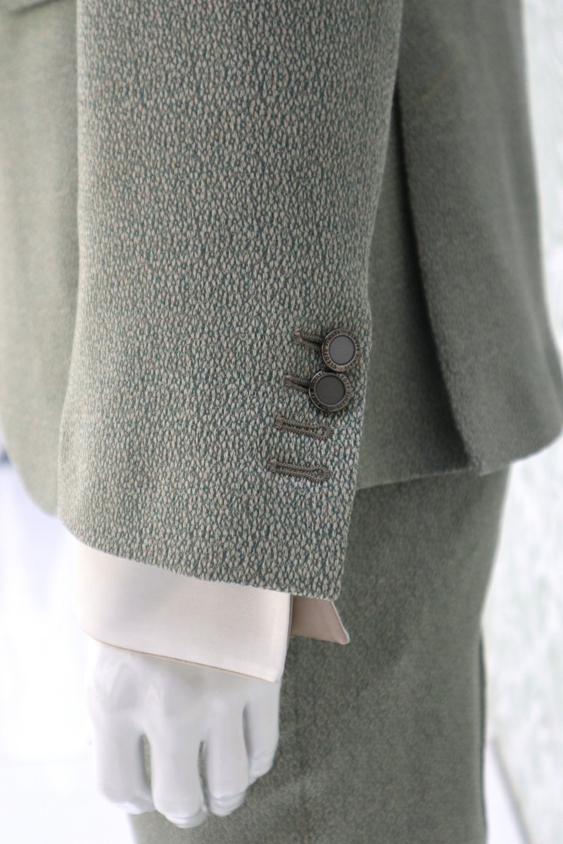 La giacca monopetto a due bottoni, con collo a lancia portabile alto per slanciare la figura o ripiegato a revers. Il fondo stondato è disegnato da una sinuosa linea curva che regala armonia all’insieme. Spalla stretta, giro manica altissimo e manica asciutta impreziosita da quattro bottoni con asole vere; schiena avvolgente a doppio spacco (scuola inglese). Eleganti le pattine delle tasche, sagomate, mentre il pantalone accompagna la giacca con linea slanciata e asciutta, esaltando la verticalità della silhouette.