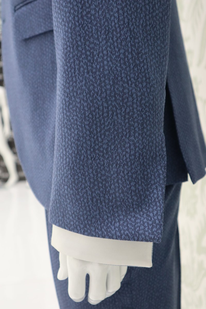 Il tessuto scelto è un raso di lana-seta (85 %lana, 15% seta) nella cromia blu polvere cangiante con micro-texture tono su tono, che richiama il cielo e l’acqua: elementi centrali del concept TERRÆ. La sua mano setosa e la luce che vibra sulle superfici conferiscono dinamismo e modernità.