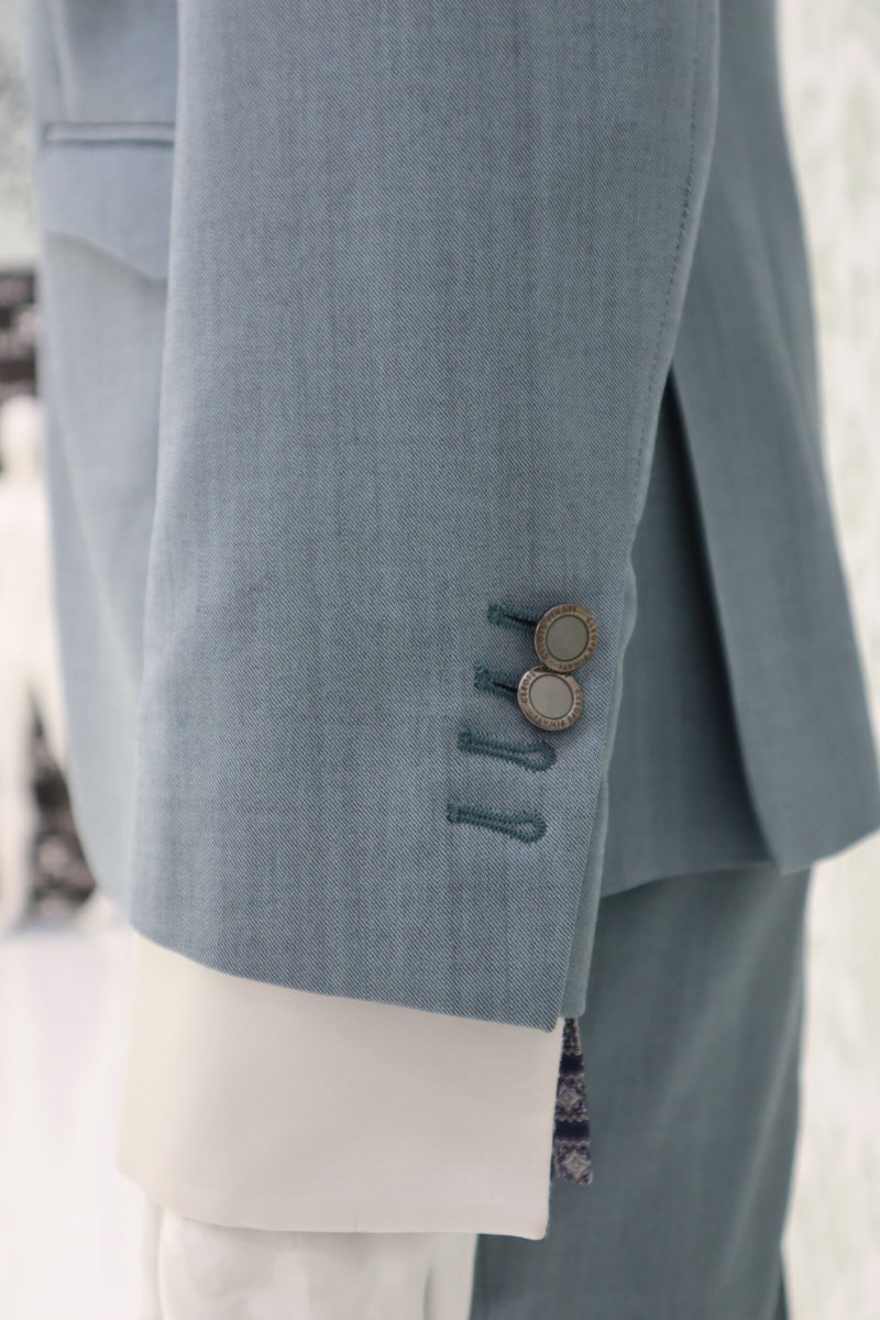 Il tessuto scelto è un pettinato leggero in lana e seta, nella cromia grigio perla con riflessi azzurro polvere, capace di coniugare freschezza visiva e comfort, con una mano raffinata e dall’effetto semi-opaco. Colore pantone di assoluta tendenza colore fogliame di quercia lavata.