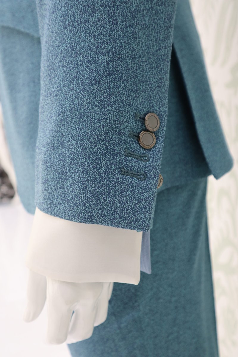 La giacca, in un raffinato tessuto in lana/seta dalle sfumature azzurro acqua polvere, rivela tutta la purezza di una cromia ispirata ai riflessi d’acqua che si posano sulle pietre antiche. Una tonalità luminosa e al tempo stesso morbida, che regala un’eleganza contemporanea e sensuale.