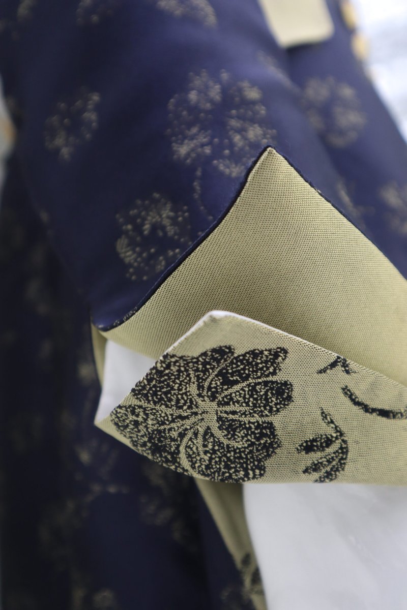 - Interno collo, interno polsi e paramontura interna in broccato solcato da maxi rose, su uno sfondo blu spento