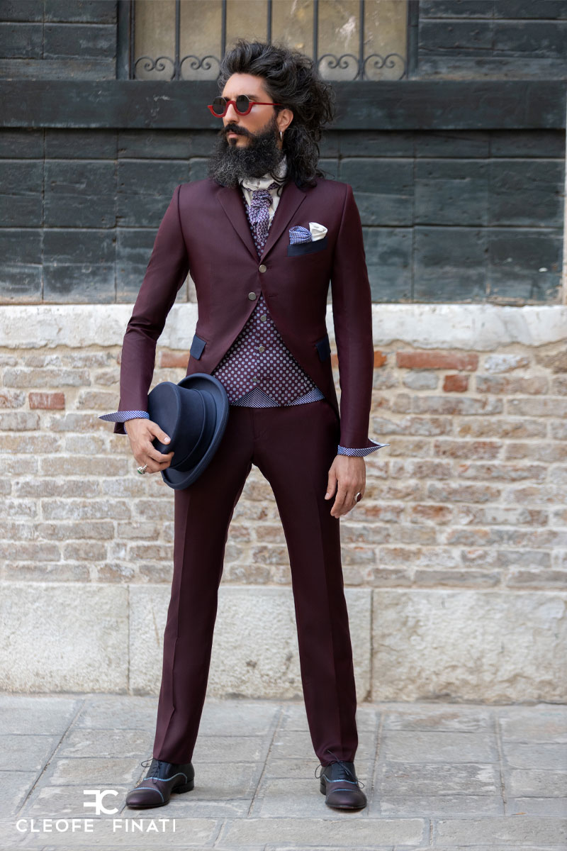 Giacca abito da sposo bordeaux in raso di seta lana made in Italy 100%. Linea fashion dandy, da poter reinventare successivamente anche su un paio di jeans.