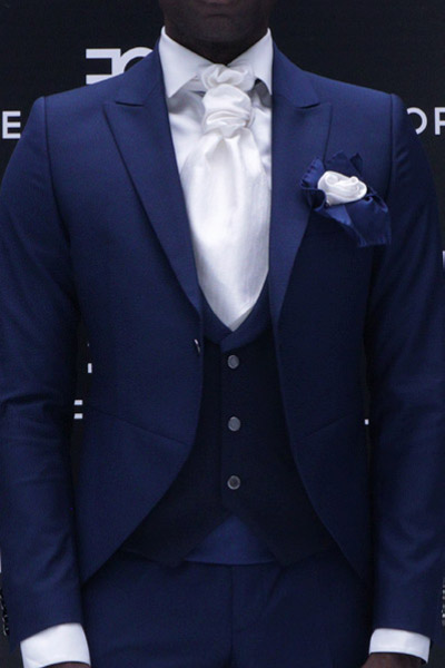 Giacca abito da sposo blu navy in raso di seta lana, una reinterpretazione moda dell’abito di Charlie Chaplin. Linea fashion e nel contempo dandy, unite da eccellenza sartoriale, ti regalano questa fantastica giacca monopetto ad un bottone, con collo a lancia unita, con sopra collo e revers della stessa dimensione per un effetto unico. Guarda la bellezza del fronte giacca da sposo, con apertura sul fronte ad enfatizzare il tuo corpo. Manica asciutta impreziosita da quattro bottoni sul polso.