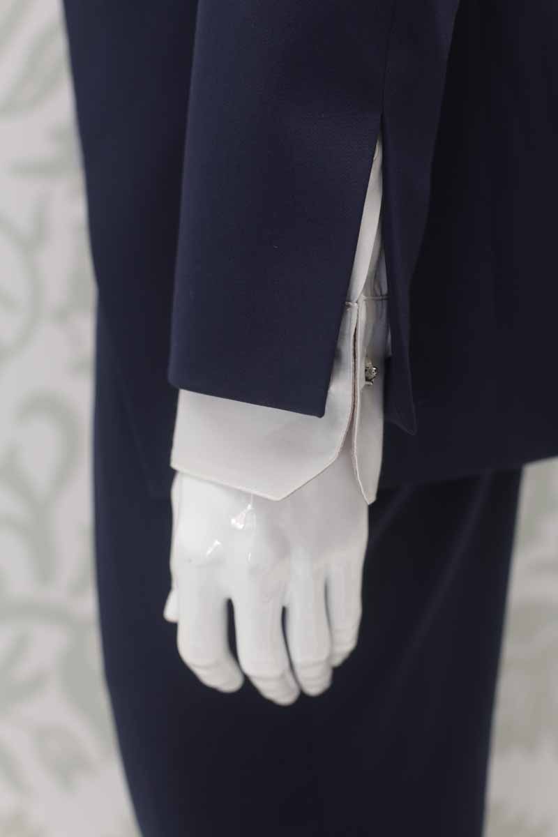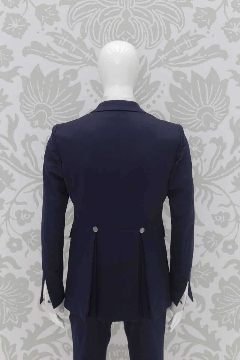 Giacca abito da sposo blu navy in raso di seta lana. Linea fashion e nel contempo dandy. La linea avanguardista dà enfasi alla bellezza del tuo corpo.
