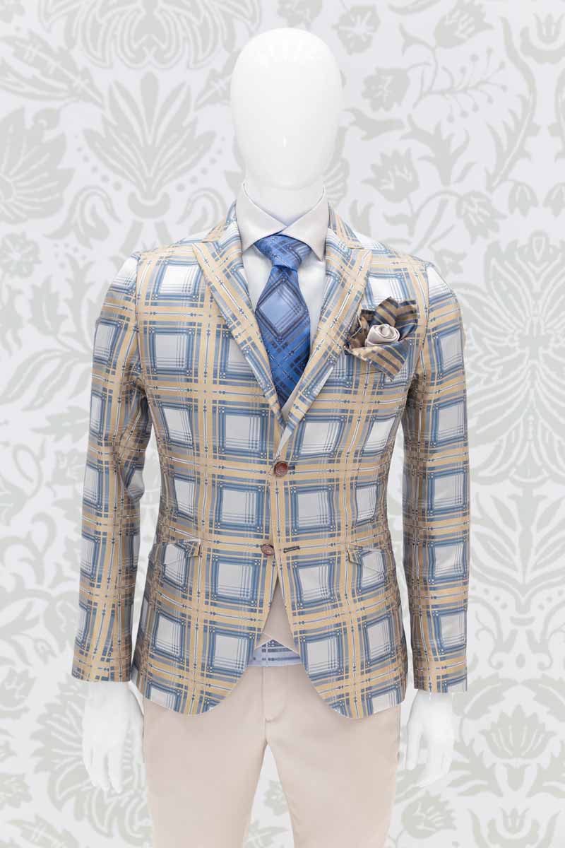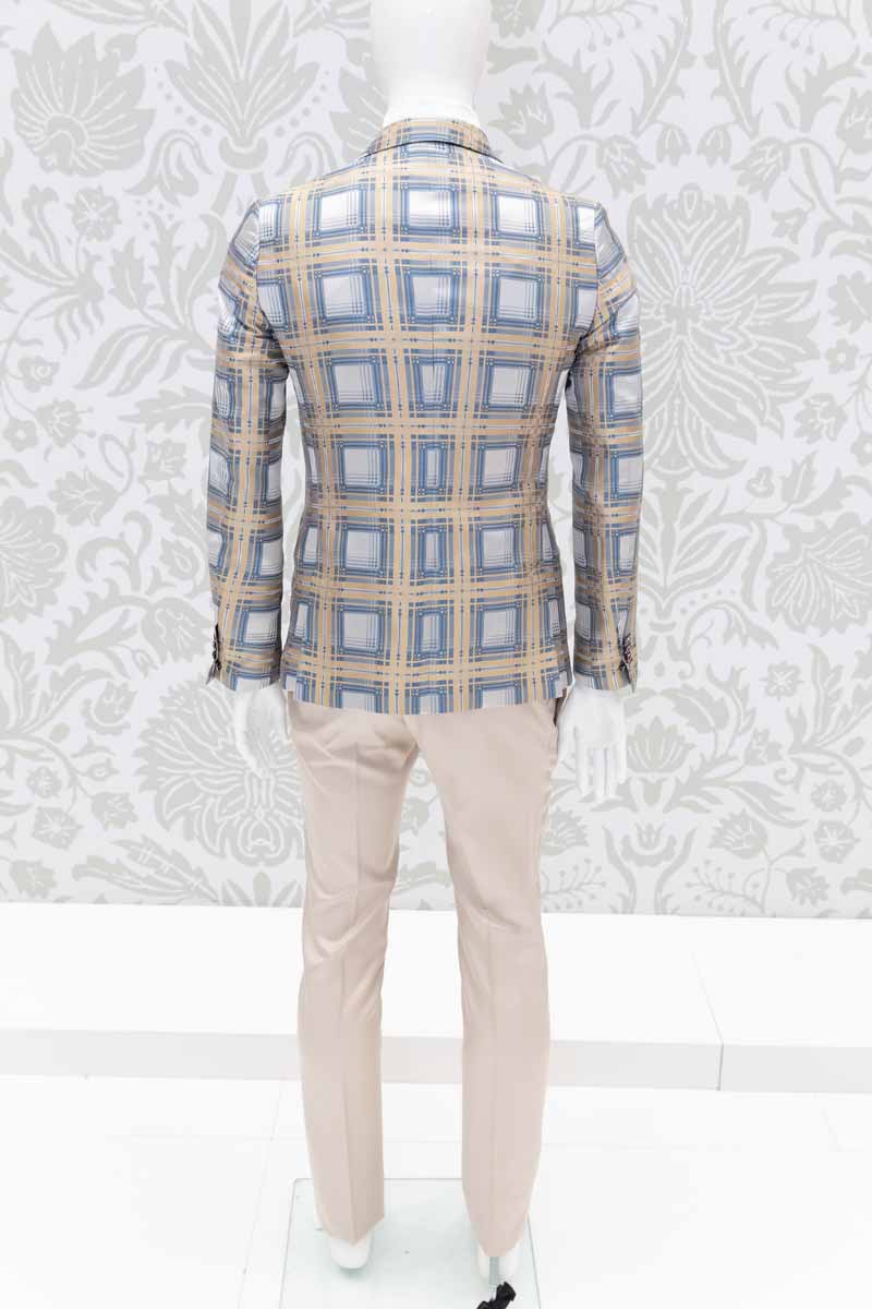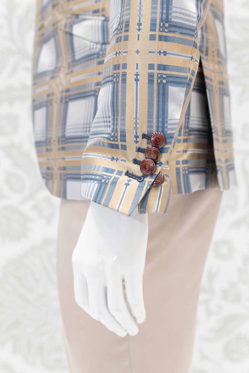 Corpo giacca in prezioso broccato tartan, 100% seta, composto da riquadri dorati e azzurro verde sovrapposti su fondali in raso color light havana; questo modello disegna perfettamente le linee del tuo corpo, slanciando la figura. Abito da uomo da indossare in qualunque occasione, anche successivamente al matrimonio, che ti permette di essere un uomo dandy ogni volta che lo desideri.