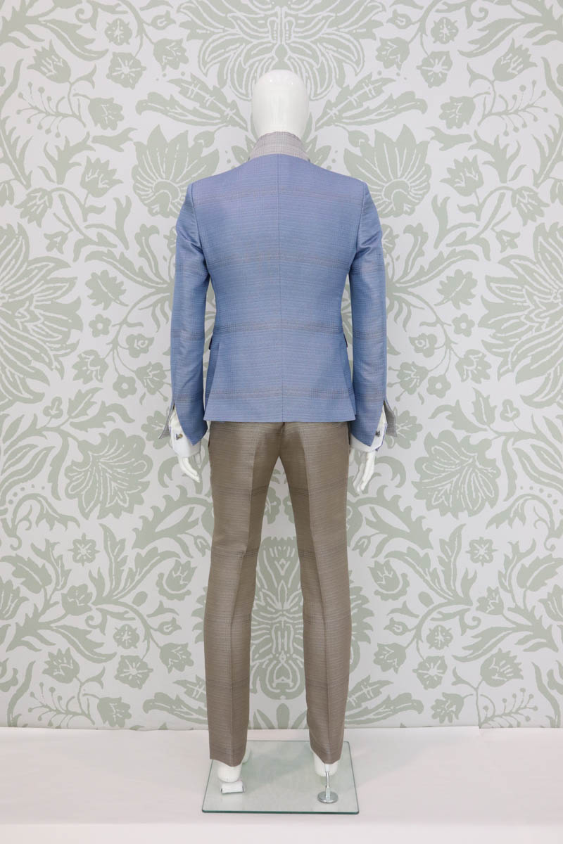 Giacca abito da uomo lusso glamour azzurro monopetto uomo linea fashion boho chic da poter indossare in qualunque occasione realizzata in broccato di seta made in Italy 100%. Reinterpretala anche su un jeans.