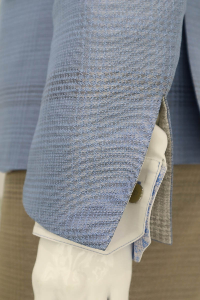 Giacca abito da uomo lusso glamour azzurro polvere. Linea moda fashion boho chic, unite da eccellenza sartoriale danno vita a questa giacca uomo monopetto a due bottoni con un collo avanguardista, con rever a lancia da poter portare alto a slanciare la tua figura o appoggiato, ad enfatizzare la linea del tuo corpo.