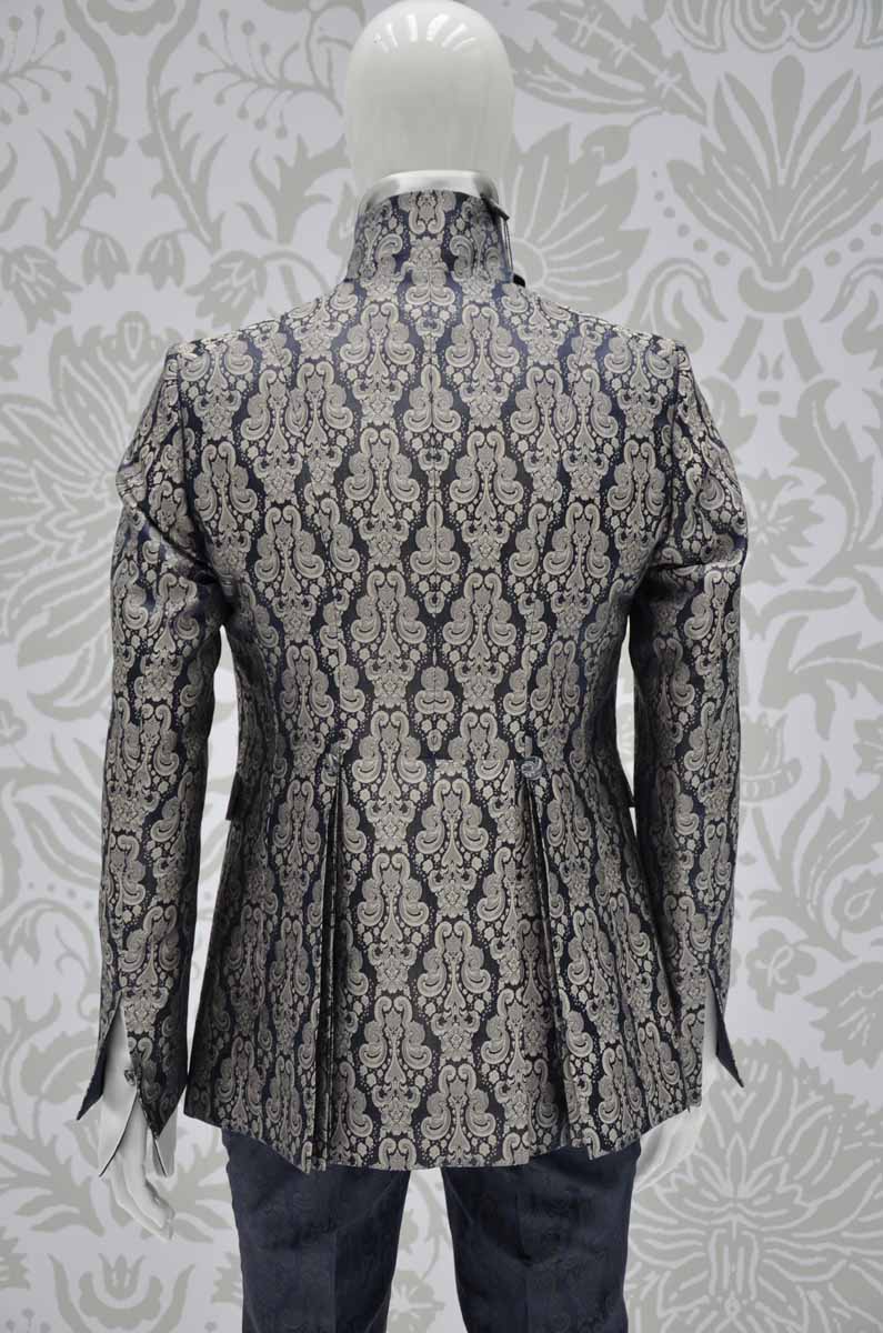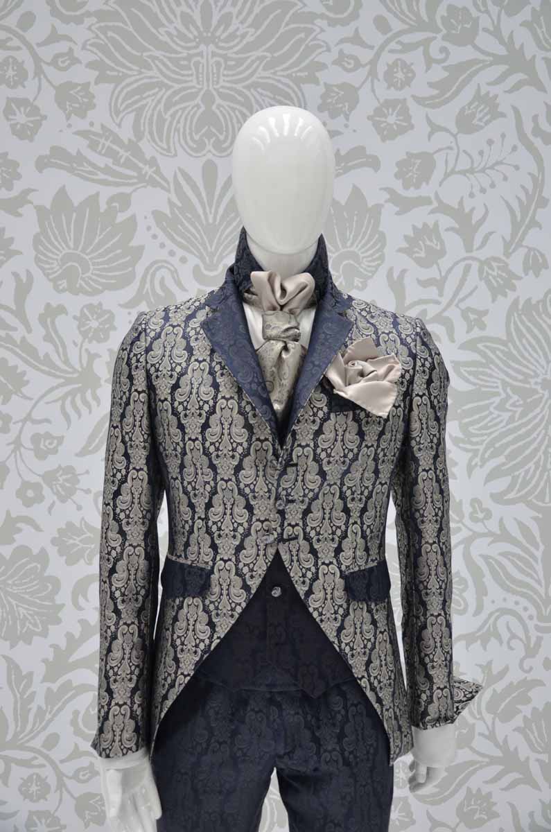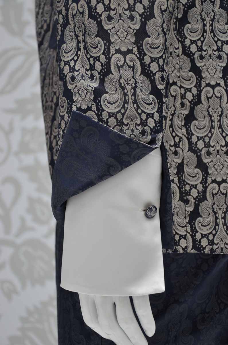 Corpo giacca in preziosissimo broccato 100% seta del disegno ecrù su densi fondali di raso di seta blu notte, enfatizzato dalla variante che rivela un disegno ombrato su interno collo e paramontura, patte tasche, taschino e interno polso; questo modello disegna perfettamente le linee del tuo corpo, slanciando la figura. Abito da uomo da indossare in qualunque occasione, anche successivamente al matrimonio, che ti permette di essere un uomo dandy ogni volta che lo desideri.