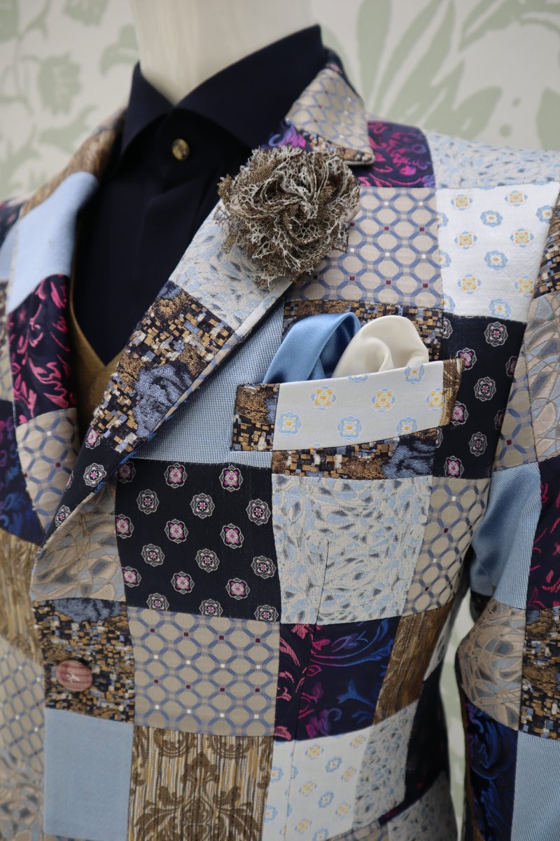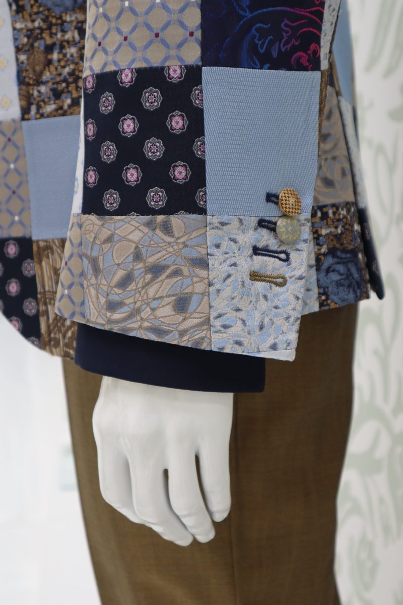 La giacca, monopetto a due bottoni, presenta revers monopetto e linea asciutta con spalle pulite e manica affusolata con asole vere. L’effetto è quello di una silhouette raffinata e dinamica, che slancia la figura. Il tessuto, un mosaico di sete 100% Made in Italy, viene composto manualmente a quadro, accostando frammenti di broccati, damaschi, jacquard e micro-geometrie in tonalità che spaziano dal blu notte al celeste polvere, dal sabbia dorato al cipria, fino a leggere sfumature lavanda. Ogni giacca è dunque una composizione tessile diversa, dove ogni centimetro racconta un equilibrio di colori e trame, un dialogo tra passato e presente.