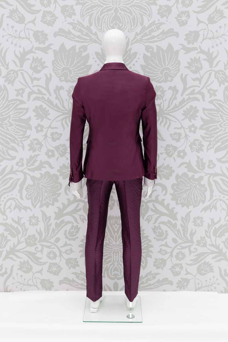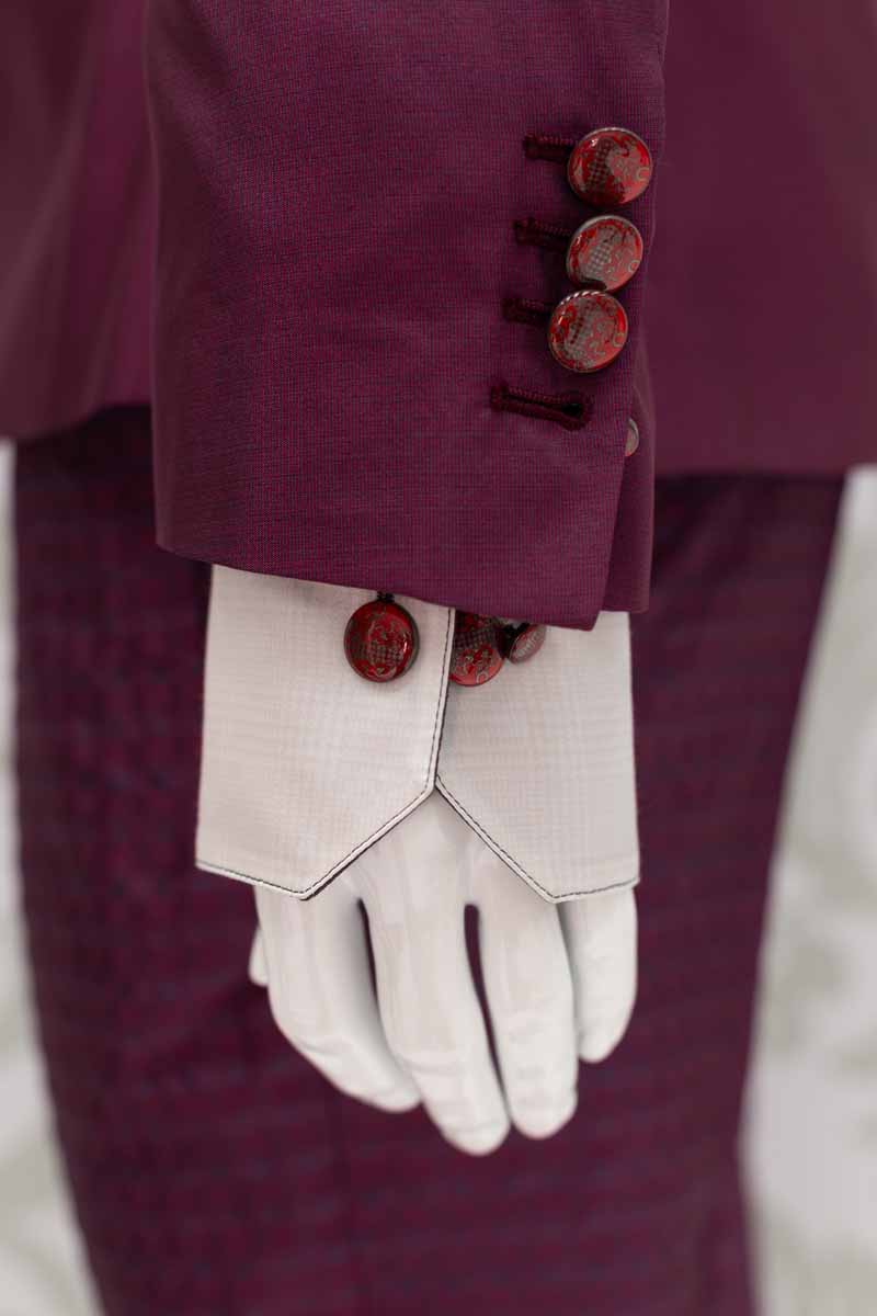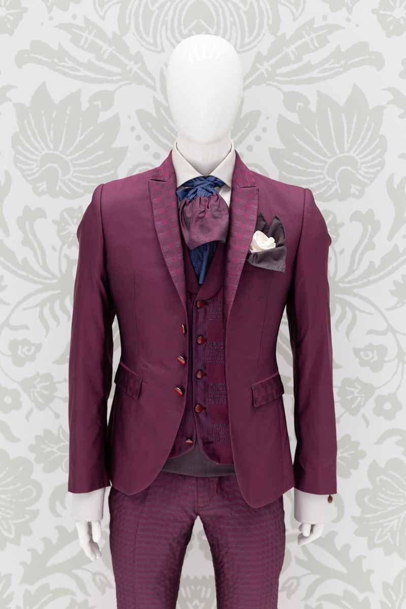 Spalla stretta, giro manica altissimo e manica asciutta, impreziosita da quattro bottoni sul polso, con corpo giacca in broccato 100% seta che intreccia note di lampone e blu che creano un elegante tono vinaccia, mentre sopracollo, revers, tasche a pattina e taschino in broccato finestrato che intreccia nuances bordeaux e blu; questo modello disegna perfettamente le linee del tuo corpo, slanciando la figura. Abito da uomo da indossare in qualunque occasione, anche successivamente al matrimonio, che ti permette di essere un uomo dandy ogni volta che lo desideri.