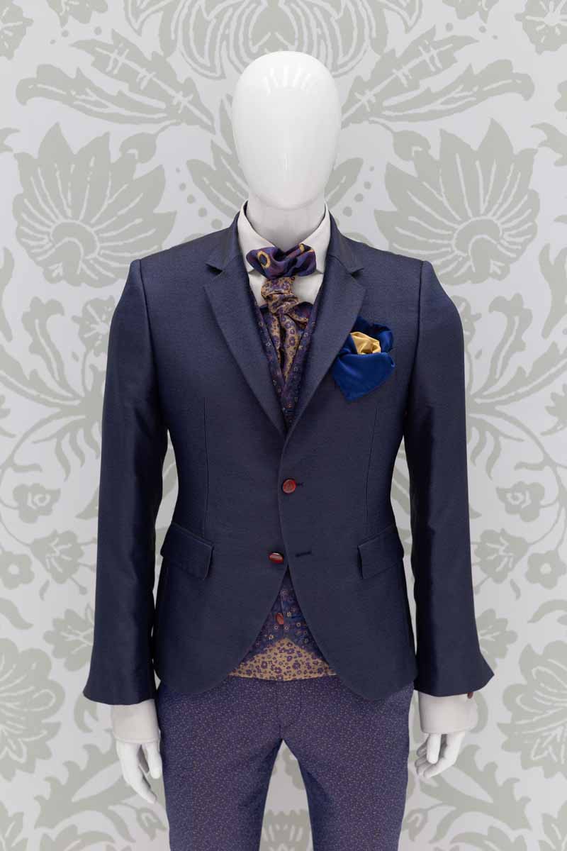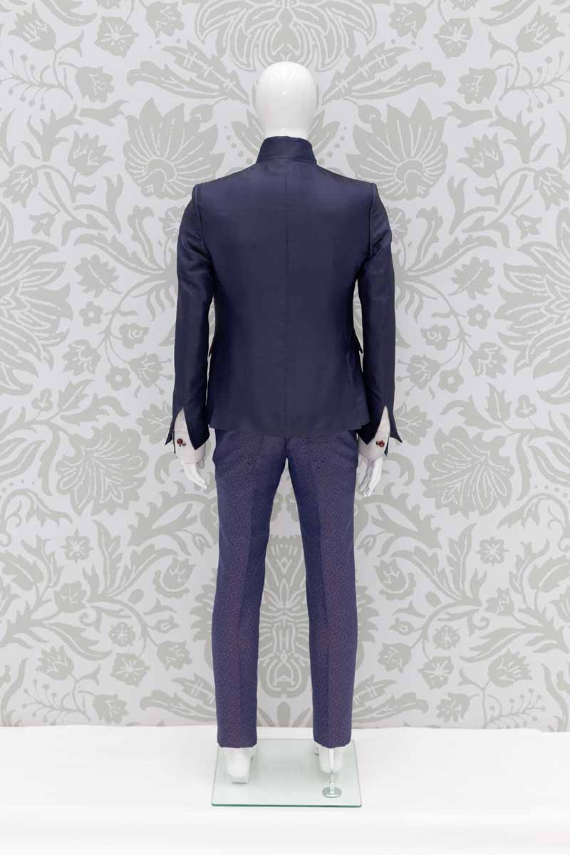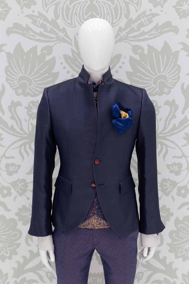 Corpo giacca in broccato 100% seta dal finish quasi rugoso, che intreccia fili su toni blu notte e azzurro lapis; questo modello disegna perfettamente le linee del tuo corpo, slanciando la tua figura. Abito da uomo da indossare in qualunque occasione, anche successivamente al matrimonio, che ti permette di essere un uomo dandy ogni volta che lo desideri.