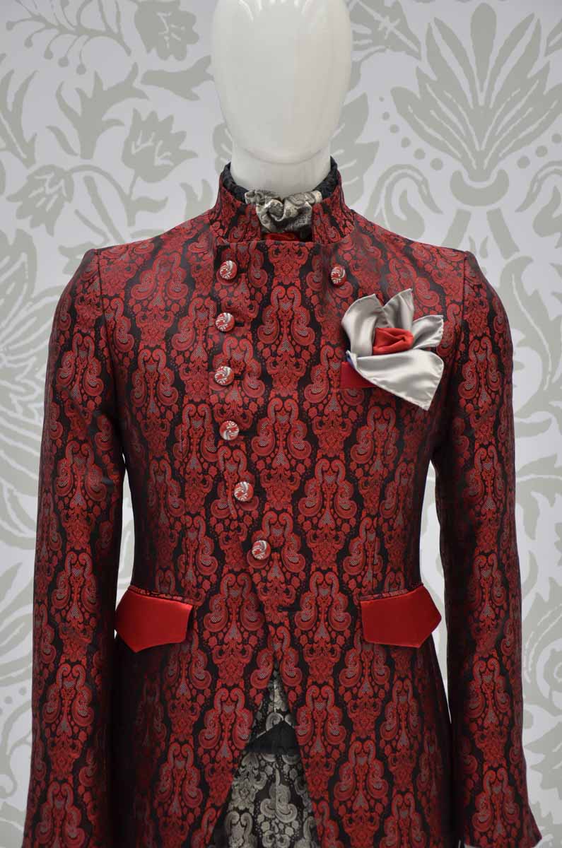 Giacca abito da uomo lusso glamour Limited Edition in un preziosissimo broccato rosso rubino su sfondi nero inchiostro. Linea fashion, unite da eccellenza sartoriale danno vita a questa marsina a un petto e mezzo dallo stile militare con collo alla coreana a sette bottoni, da portare regalmente con abbottonatura alta o aperta con effetto revers fermato da due bottoni, ad enfatizzare la linea del tuo corpo.